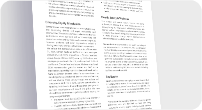 Below are key areas in the U.S. where we continue to assess and adjust as needed to support our team members. • We continue to offer key preventative services and for mothers, we provide opportunities to help support and transition back to the workforce. • We increased Infertility benefits and the number of Parental Leave days while continuing to provide child care discounts at multiple day care facilities. • We understand our team members have individualized needs and we offer programs to support them, such as global employee assistance programs (EAP) counseling and also benefits such as transgender surgery/medical benefits. Diversity, Equity & Inclusion Zimmer Biomet remains committed to creating, supporting and celebrating diverse and equal workplaces and communities. We continue to foster and embrace diversity and inclusion within our team and our communities, and commit our voices and our resources to community groups, business platforms and other organizations united to driving meaningful change and sustained improvement. We believe that representation matters. As of December 31, 2021, women made up 35.1% of our total employee population, and 25.1% of positions at Director level and above. People of Color (POC) made up 22.1% of our total employee population in the U.S., and comprised 15.2% of positions at Director level and above. We have established 2026 representation goals for women and POC in the organization, guided by internal and external benchmarks. Core to Zimmer Biomet’s values is our commitment to stand together against hatred, discrimination and injustice, and we advance these values through our actions and investments. With this in mind, we have committed to the following initiatives to drive and accelerate change within our own organization and around the globe. We have shared these commitments publicly and are tracking our progress against them: • Engage our more than 20,000 global team members in cultural awareness and inclusion programming. • Invest $1 million and provide executive sponsorship to support ongoing programs and elevate the impact of our ERGs. • Commit at least $5 million over five years through the Zimmer Biomet Foundation to nonprofit organizations globally dedicated to combating racism and supporting diversity, equality and justice. The Zimmer Biomet Foundation is an independent, nonprofit organization established in 2018 to address the needs of our global community. You can read more about the Zimmer Biomet Foundation below. • Match, through the Zimmer Biomet Foundation, employee financial contributions to nonprofit organizations, including those dedicated to combating racism and supporting diversity, equality and justice. • Expand our student and early career internship programs to attract and develop more Black leaders. • Continue our financial support of Movement is Life, a multidisciplinary coalition seeking to eliminate racial, ethnic and gender disparities in muscle and joint health. Health, Safety & Wellness The physical and mental health, financial well-being and work/life balance of our team members are vital to accomplishing our Mission and achieving our goals. We sponsor wellness programs designed to enhance physical, financial and mental well-being, and encourage participation in these programs through regular communications, educational sessions and other incentives. We are also intensely focused on the health and safety of our team members in the workplace. Our environmental, health and safety team constantly monitors various metrics to ensure we are providing the safest environment in which to work. In 2021, our Total Recordable Incident Rate, which is defined as recordable incidents multiplied by 200,000 hours worked divided by total hours worked, was 0.29 and our Lost Time Incident Rate, which is defined as lost time incidents multiplied by 200,000 hours worked divided by total hours worked, was 0.14. Pay Equity We are committed to our pay equity process and we conduct annual pay equity reviews. Our comprehensive pay equity review covers pay, promotions and new hire practices. This includes various types of pay, such as base salary, bonus, long-term incentives and new hire sign-on awards (cash or equity). Prior to 2019, the pay equity review was focused on gender differences, with any identified pay issue also being reviewed for ethnicity against similarly situated positions. Starting in 2019, we further enhanced our analysis to review pay differences by gender, age, ethnicity and location, and in 2020 engaged a new external partner with increased analytical capabilities. Each year we assess our analysis capabilities to identify areas of opportunity. 10