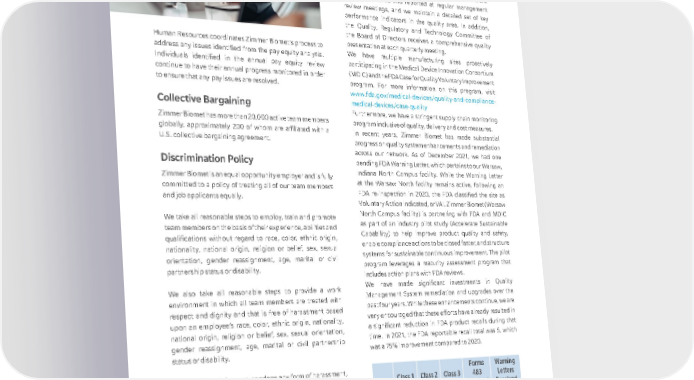 Human Resources coordinates Zimmer Biomet’s process to address any issues identified from the pay equity analysis. Individuals identified in the annual pay equity review continue to have their annual progress monitored in order to ensure that any pay issues are resolved. Collective Bargaining Zimmer Biomet has more than 20,000 active team members globally, approximately 200 of whom are affiliated with a U.S. collective bargaining agreement. Discrimination Policy Zimmer Biomet is an equal opportunity employer and is fully committed to a policy of treating all of our team members and job applicants equally. We take all reasonable steps to employ, train and promote team members on the basis of their experience, abilities and qualifications without regard to race, color, ethnic origin, nationality, national origin, religion or belief, sex, sexual orientation, gender reassignment, age, marital or civil partnership status or disability. We also take all reasonable steps to provide a work environment in which all team members are treated with respect and dignity and that is free of harassment based upon an employee’s race, color, ethnic origin, nationality, national origin, religion or belief, sex, sexual orientation, gender reassignment, age, marital or civil partnership status or disability. Zimmer Biomet does not condone any form of harassment, whether engaged in by team members or by outside third parties who do business with us. Product Quality Zimmer Biomet is committed to best-in-class product quality and the robustness of our Quality Management System. Every site has a stringent internal quality audit program. In addition, we have an independent corporate quality audit program and are audited periodically by external regulatory bodies such as the U.S. Food and Drug Administration (FDA) and other regulatory and nongovernmental competent authorities around the world. Our internal corporate audit and external audit results are closely monitored and reported at regular management review meetings, and we maintain a detailed set of key performance indicators in the quality area. In addition, the Quality, Regulatory and Technology Committee of the Board of Directors receives a comprehensive quality presentation at each quarterly meeting. We have multiple manufacturing sites proactively participating in the Medical Device Innovation Consortium (MDIC) and the FDA Case for Quality Voluntary Improvement program. For more information on this program, visit www.fda.gov/medical-devices/quality-and-compliance- medical-devices/case-quality Furthermore, we have a stringent supply chain monitoring program inclusive of quality, delivery and cost measures. In recent years, Zimmer Biomet has made substantial progress on quality system enhancements and remediation across our network. As of December 2021, we had one pending FDA Warning Letter, which pertains to our Warsaw, Indiana North Campus facility. While the Warning Letter at the Warsaw North facility remains active, following an FDA re-inspection in 2020, the FDA classified the site as Voluntary Action Indicated, or VAI. Zimmer Biomet (Warsaw North Campus facility) is partnering with FDA and MDIC as part of an industry pilot study (Accelerate Sustainable Capability) to help improve product quality and safety, enable compliance actions to be closed faster, and structure systems for sustainable continuous improvement. The pilot program leverages a maturity assessment program that includes action plans with FDA reviews. We have made significant investments in Quality Management System remediation and upgrades over the past four years. While these enhancements continue, we are very encouraged that these efforts have already resulted in a significant reduction in FDA product recalls during that time. In 2021, the FDA reportable recall total was 5, which was a 75% improvement compared to 2020. Year Class 1 Recalls Class 2 Recalls Class 3 Recalls Forms 483 Received Warning Letters Received 2016 1 40 1 3 1 2017 1 62 0 7 0 2018 1 48 0 3 1 2019 1 24 0 3 0 2020 0 21 0 1 0 2021 1 4 0 0 0 11