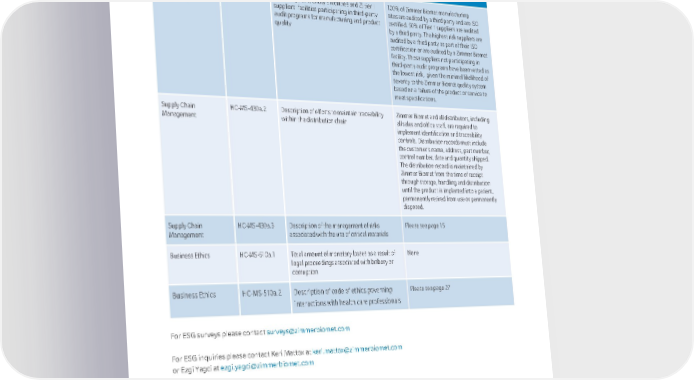 To p i c Code SASB Metric 2021 Reporting Supply Chain Management HC-MS-430a.1 Percentage of 1) entity's facilities and 2) tier I suppliers' facilities participating in third-party audit programs for manufacturing and product quality 100% of Zimmer Biomet manufacturing sites are audited by a third party and are ISO certified. 50% of Tier 1 suppliers are audited by a third party. The highest risk suppliers are audited by a third party as part of their ISO certification or are audited by a Zimmer Biomet facility. Those suppliers not participating in third-party audit programs have been vetted as the lowest risk, given the minimal likelihood of severity to the Zimmer Biomet quality system based on a failure of the product or service to meet specifications. Supply Chain Management HC-MS-430a.2 Description of efforts to maintain traceability within the distribution chain Zimmer Biomet and all distributors, including all sales and office staff, are required to implement identification and traceability controls. Distribution records must include the customer's name, address, part number, control number, date and quantity shipped. The distribution record is maintained by Zimmer Biomet from the time of receipt through storage, handling and distribution until the product is implanted into a patient, permanently retired from use or permanently disposed. Supply Chain Management HC-MS-430a.3 Description of the management of risks associated with the use of critical materials Please see page 15 Business Ethics H C - M S - 510 a .1 Total amount of monetary losses as a result of legal proceedings associated with bribery or corruption None Business Ethics HC-MS-510a.2 Description of code of ethics governing interactions with health care professionals Please see page 27 For ESG surveys please contact surveys@zimmerbiomet.com For ESG inquiries please contact Keri Mattox at keri.mattox@zimmerbiomet.com or Ezgi Yagci at ezgi.yagci@zimmerbiomet.com 27