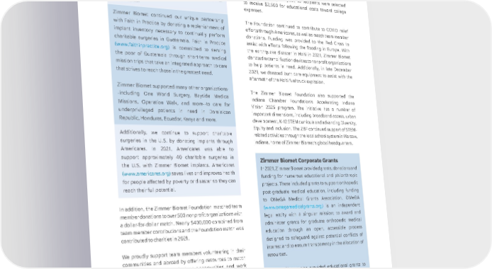 Zimmer Biomet Medical Missions Zimmer Biomet donated orthopedic products to support more than 15 philanthropic medical mission trips in 2021 to help patients in need around the globe. Due to the ongoing pandemic, several planned medical mission trips were postponed and rescheduled for future dates. Zimmer Biomet continued our unique partnership with Faith in Practice by donating a replenishment of implant inventory necessary to continually perform charitable surgeries in Guatemala. Faith in Practice (www.faithinpractice.org) is committed to serving the poor of Guatemala through short-term medical mission trips that take an integrated approach to care that strives to reach those in the greatest need. Zimmer Biomet supported many other organizations- -including One World Surgery, Bayside Medical Missions, Operation Walk, and more--to care for underprivileged patients in need in Dominican Republic, Honduras, Ecuador, Kenya and more. Additionally, we continue to support charitable surgeries in the U.S. by donating implants through Americares. In 2021, Americares was able to support approximately 40 charitable surgeries in the U.S. with Zimmer Biomet implants. Americares (www.americares.org) saves lives and improves health for people affected by poverty or disaster so they can reach their full potential. In addition, the Zimmer Biomet Foundation matched team member donations to over 500 nonprofit organizations with a dollar-for-dollar match. Nearly $400,000 combined from team member contributions and the Foundation match was contributed to charities in 2021. We proudly support team members volunteering in their communities and abroad by offering resources to match team members with volunteer opportunities and work policies that allow them to take the time to support their community. For the first year collectively capturing data on the volunteer program, team members logged close to 3,000 hours of giving back to their community. Some of those organizations include Feed My Starving Children, Prospect Hospice Limited, Bumbleance Ireland (Saoirse Foundation) and the United Way. In addition, team members organized several collection drives to provide needed items for back- to-school efforts and help during the holidays. The Zimmer Biomet Foundation created the Zimmer Biomet Scholarship Fund for dependents of team members in the U.S. For the inaugural year, 10 recipients were selected to receive $2,500 for educational costs toward college expenses. The Foundation continued to contribute to COVID relief efforts through Americares, as well as match team member donations. Funding was provided to the Red Cross to assist with efforts following the flooding in Europe. With the earthquake disaster in Haiti in 2021, Zimmer Biomet donated external fixation devices to nonprofit organizations to help patients in need. Additionally, in late December 2021, we donated burn care equipment to assist with the aftermath of the Haiti fuel truck explosion. The Zimmer Biomet Foundation also supported the Indiana Chamber Foundation’s Accelerating Indiana Vision 2025 program. The initiative has a number of important dimensions, including broadband access, urban development, K-12 STEM curricula and advancing Diversity, Equity and Inclusion. The ZBF continued support of STEM- related activities through the local school system in Warsaw, Indiana, home of Zimmer Biomet’s global headquarters. Zimmer Biomet Corporate Grants In 2021, Zimmer Biomet provided grants, donations and funding for numerous educational and philanthropic projects. These included grants to support orthopedic post-graduate medical education, including funding to OMeGA Medical Grants Association. OMeGA (www.omegamedicalgrants.org) is an independent legal entity with a singular mission: to award and administer grants for graduate orthopedic medical education through an open, accessible process designed to safeguard against potential conflicts of interest and to ensure transparency in the allocation of resources. Zimmer Biomet also provided educational grants to support independent medical education conferences that promote scientific knowledge, medical advancement and the delivery of effective healthcare. In addition, Zimmer Biomet provided grants to third- party organizations for independent research to advance patient treatment designed for improved outcomes. 15