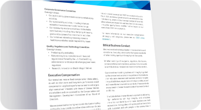 20 Corporate Governance Committee Oversight Areas: • Our public policy, government relations and advocacy activities • Our sustainability activities, including initiatives related to the environment and climate change • Our community relations activities and charitable contributions, including the underlying philosophy, goals and purposes of our contribution activities • Our initiatives related to promoting access to healthcare and other social responsibility issues Quality, Regulatory and Technology Committee Oversight Areas: • Product quality and safety • Risks relating to our compliance with laws and regulations enforced by the U.S. Food and Drug Administration and comparable foreign government regulators • Research, innovation and technology initiatives Executive Compensation Our executives receive fixed compensation (base salary), as well as short-term and long-term performance-based compensation. Applicable performance metrics and targets align executives’ interests with those of Zimmer Biomet shareholders and are approved by the Compensation and Management Development Committee of our Board of Directors. We are committed to the highest standards of patient safety and quality in our products and services and to world-class integrity and ethical business practices. In support of this commitment, and to drive accountability for compliance with, and sustained improvements in, our global quality system, the Compensation and Management Development Committee included a global quality bonus modifier component to executives’ annual cash incentive plan in 2021. The modifier was designed such that, based on the achievement of specified global quality metrics related to our FDA inspection results, it could result in a decrease (but not an increase) to executives’ 2021 bonus payouts by up to 5%. In 2021, across our global network, we received no new FDA Warning Letters and our average number of Form 483 observations per inspection was less than 3.0. As a result, the global quality bonus modifier had no impact on our executives’ 2021 bonus payouts. For more information on our executive compensation philosophy and programs, please see our 2022 proxy statement . Ethical Business Conduct We are committed to being a leader in the area of ethics and compliance. Every day, we strive for the highest standards of patient safety, quality and integrity in all that we do. Whether working with surgeons, regulators, distributors, partners or fellow team members, we know that what we do to contribute to our mission is as important as how we do it. Our commitment to doing business with integrity is guided by the comprehensive compliance policies and procedures that help team members and business partners navigate the applicable laws, regulations and industry codes, as well as Zimmer Biomet’s own ethical standards. These standards are outlined in Zimmer Biomet’s Code of Business Conduct and Ethics. The Code defines Zimmer Biomet’s approach to delivering high performance with high integrity, and articulates the ethical standards by which team members are held accountable. It also guides and inspires positive interactions with customers and with people in the communities in which we live and work. So that every team member understands and is accountable for our Code, and has access to it, it is available online in 33 languages. Zimmer Biomet also requires training for all newly hired team members within the first 60 days of employment and retrains all team members annually.