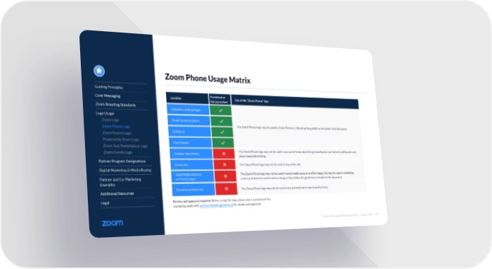 Partner Messaging and Branding Guide | January 2022 | 32 Guiding Principles Core Messaging Zoom Branding Standards Logo Usage Zoom Logo Zoom Phone Logo Zoom Rooms Logo Powered by Zoom Logo Zoom App Marketplace Logo Zoom Events Logo Partner Program Designations Digital Marketing & Media Buying Partner-Led Co-Marketing Examples Additional Resources Legal Zoom Phone Usage Matrix Location Permitted or Not permitted Use of the “Zoom Phone” logo Websites, Landing Pages The Zoom Phone logo may be used by Zoom Partners, following the guidelines included in this document. Email Communications Collateral Event Assets Outdoor Advertising The Zoom Phone logo may not be used in any out of home advertising including but not limited to billboards and place-based advertising. Online Ads The Zoom Phone logo may not be used in any online ads. Social Media Account or Profile Images The Zoom Phone logo may not be used in social media account profile images, but may be used in marketing assets promoted on social media as long as they follow the guidelines included in this document. Promotional Materials The Zoom Phone logo may not be used in any promotional or merchandise items. Review and approval required. Before using this logo, please share a preview of the marketing asset with [email protected] for review and approval.