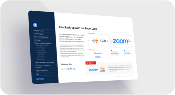 Partner Messaging and Branding Guide | January 2022 | 61 Guiding Principles Core Messaging Zoom Branding Standards Logo Usage Partner Program Designations Program Designations Partner Badges Certified Badge Partner Lock-ups Usage Matrix Do’s & Don’ts Joint Lock-up Digital Marketing & Media Buying Partner-Led Co-Marketing Examples Additional Resources Legal Do not create a joint logo lock-up with any symbol other than a vertical or horizontal divider, providing clear space for each logo. Partners should not use Zoom brand elements to appear as an extension of Zoom. Joint Lock-up with the Zoom Logo For approved partners, those in a Zoom Partner Program, you may use a joint lock-up within your Partner-led or Partner-generated marketing material. As logos come in all shapes and sizes, there is no perfect science but please ensure there is an even balance between your logo and the Zoom logo, and neither logo is more prominent. Our partnership lock-up must always include a divider unless previously agreed upon. Zoom’s logo should be secondary (on the right side) for partner-led co-marketing materials, and never be smaller than 18px in height. 75% 150% 100% Web: #BABACC Print: Pantone 5495C Minimum Width: 1px Web: #2D8CFF Print: Pantone 279C Minimum Size + DON’T 18px Vertical Lockup Horizontal Lockup