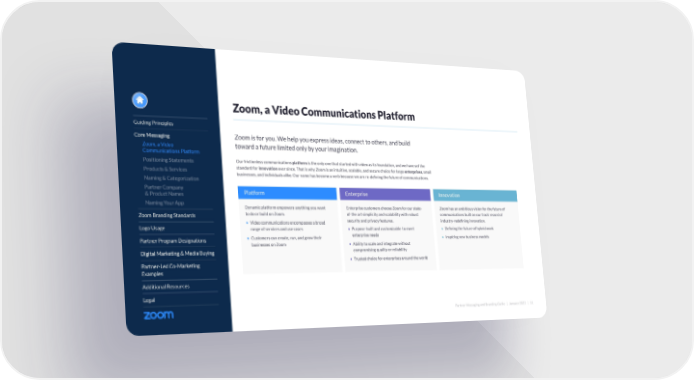 Partner Messaging and Branding Guide | January 2022 | 11 Guiding Principles Core Messaging Zoom, a Video Communications Platform Positioning Statements Products & Services Naming & Categorization Partner Company & Product Names Naming Your App Zoom Branding Standards Logo Usage Partner Program Designations Digital Marketing & Media Buying Partner-Led Co-Marketing Examples Additional Resources Legal Zoom is for you. We help you express ideas, connect to others, and build toward a future limited only by your imagination. Our frictionless communications platform is the only one that started with video as its foundation, and we have set the standard for innovation ever since. That is why Zoom is an intuitive, scalable, and secure choice for large enterprises , small businesses, and individuals alike. Our name has become a verb because we are re-defining the future of communications. Zoom, a Video Communications Platform Dynamic platform empowers anything you want to do or build on Zoom. • Video communications encompasses a broad range of services and use cases • Customers can create, run, and grow their businesses on Zoom Platform Enterprise customers choose Zoom for our state- of-the art simplicity and scalability with robust security and privacy features. • Purpose-built and customizable to meet enterprise needs • Ability to scale and integrate without compromising quality or reliability • Trusted choice for enterprises around the world Enterprise Zoom has an ambitious vision for the future of communications built on our track record of industry-redefining innovation. • Defining the future of hybrid work • Inspiring new business models Innovation