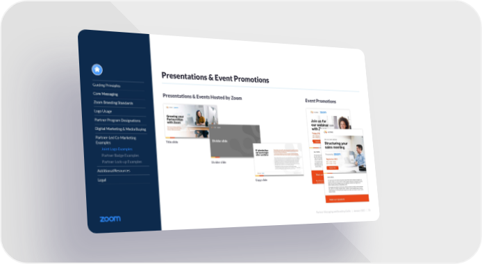 Partner Messaging and Branding Guide | January 2022 | 70 Guiding Principles Core Messaging Zoom Branding Standards Logo Usage Partner Program Designations Digital Marketing & Media Buying Partner-Led Co-Marketing Examples Joint Logo Examples Partner Badge Examples Partner Lock-up Examples Additional Resources Legal Presentations & Event Promotions Presentations & Events Hosted by Zoom Event Promotions Title slide Divider slide Copy slide