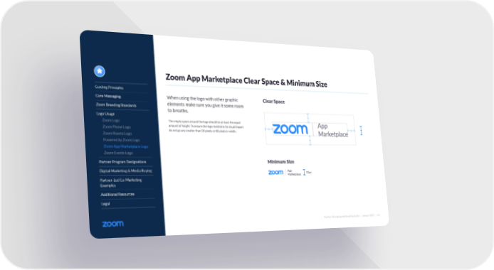 Partner Messaging and Branding Guide | January 2022 | 43 When using the logo with other graphic elements make sure you give it some room to breathe. The empty space around the logo should be at least the equal amount of height. To ensure the logo maintains its visual impact do not go any smaller than 18 pixels or 80 pixels in width. Zoom App Marketplace Clear Space & Minimum Size 32px Clear Space Minimum Size Guiding Principles Core Messaging Zoom Branding Standards Logo Usage Zoom Logo Zoom Phone Logo Zoom Rooms Logo Powered by Zoom Logo Zoom App Marketplace Logo Zoom Events Logo Partner Program Designations Digital Marketing & Media Buying Partner-Led Co-Marketing Examples Additional Resources Legal