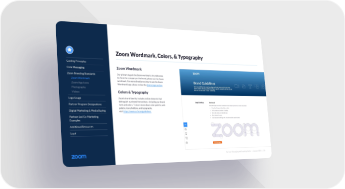 Partner Messaging and Branding Guide | January 2022 | 20 Guiding Principles Core Messaging Zoom Branding Standards Zoom Wordmark Zoom App Icons Photography Videos Logo Usage Partner Program Designations Digital Marketing & Media Buying Partner-Led Co-Marketing Examples Additional Resources Legal Zoom Wordmark, Colors, & Typography Zoom Wordmark Our primary logo is the Zoom wordmark. Any reference to Zoom the company or the brand, please use the Zoom wordmark. For more direction on how to use the Zoom Wordmark Logo please review the Zoom Logo section. Colors & Typography Zoom’s brand identity includes visible elements that distinguish our brand from others—including our brand fonts and colors. To learn more about color palette, web palette, icons/buttons, and typography, visit https://zoom.us/brandguidelines.