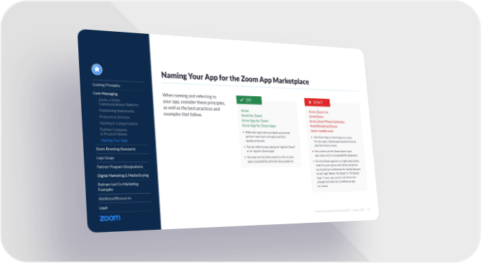 Partner Messaging and Branding Guide | January 2022 | 18 Guiding Principles Core Messaging Zoom, a Video Communications Platform Positioning Statements Products & Services Naming & Categorization Partner Company & Product Names Naming Your App Zoom Branding Standards Logo Usage Partner Program Designations Digital Marketing & Media Buying Partner-Led Co-Marketing Examples Additional Resources Legal Naming Your App for the Zoom App Marketplace Acme Acme for Zoom Acme App for Zoom Acme App for Zoom Apps • Make your app name as simple as just your partner name and a strong brand that stands on its own • You can refer to your app as an “app for Zoom” or an “app for Zoom Apps” • You may use the Zoom mark to refer to your app’s compatibility with the Zoom platform DO Acme Zoom, Inc AcmeZoom Acme Zoom Phone Solutions HeatlhSolution4Zoom zoom-reseller.com • Use Zoom App or Zoom Apps as a noun for your app. A Zoom app should only be an app that Zoom creates • You cannot use the Zoom mark in your app name, only in a compatibility statement • Do not choose a generic or highly descriptive name for your app so only Zoom stands out as a brand (i.e. Conference for Zoom). Be sure to use “app” before “for Zoom” or “for Zoom Apps” if your app name is not distinctive enough on its own (i.e. Conference app for Zoom) When naming and referring to your app, consider these principles, as well as the best practices and examples that follow. DON’T