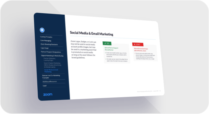 Partner Messaging and Branding Guide | January 2022 | 66 Guiding Principles Core Messaging Zoom Branding Standards Logo Usage Partner Program Designations Digital Marketing & Media Buying Partner Websites, Landing Pages Search Engine Marketing (SEO), Display Advertising & Domain names Social Media & Email Marketing Partner-Led Co-Marketing Examples Additional Resources Legal Social Media & Email Marketing Zoom Logos, Badges, or Lock-ups may not be used in social media account profile images, but may be used in a marketing asset that is promoted on social media as long as the asset follows the brand guidelines. #AcmePartnerZoomtopia @AcmePartner_Zoom • Do not create social media handles, tags, account images, or the like that include Zoom brands, abbreviations of those brands or anything confusingly similar, icons, or logos DON’T @AcmePartnerSupport #AcmePartner • Create social media handles, tags, or the like that properly identify your company and its brands only • For email, use your name in the subject line to make it clear the email is from your company DO