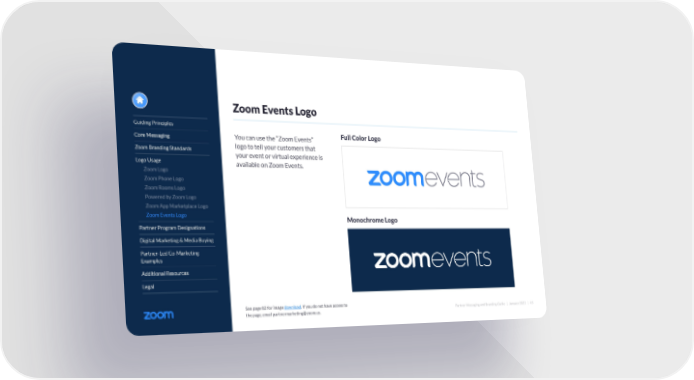 Partner Messaging and Branding Guide | January 2022 | 45 You can use the “Zoom Events” logo to tell your customers that your event or virtual experience is available on Zoom Events. Zoom Events Logo Full Color Logo Monochrome Logo Guiding Principles Core Messaging Zoom Branding Standards Logo Usage Zoom Logo Zoom Phone Logo Zoom Rooms Logo Powered by Zoom Logo Zoom App Marketplace Logo Zoom Events Logo Partner Program Designations Digital Marketing & Media Buying Partner-Led Co-Marketing Examples Additional Resources Legal See page 82 for image download. If you do not have access to the page, email [email protected].
