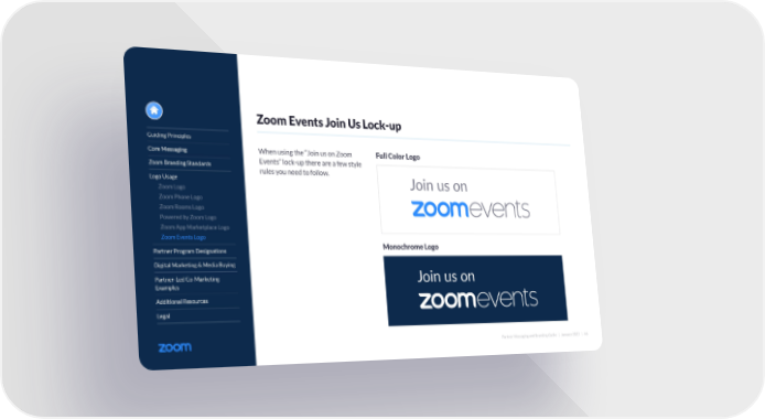 Partner Messaging and Branding Guide | January 2022 | 46 Zoom Events Join Us Lock-up Join us on Join us on When using the “Join us on Zoom Events” lock-up there are a few style rules you need to follow. Full Color Logo Monochrome Logo Guiding Principles Core Messaging Zoom Branding Standards Logo Usage Zoom Logo Zoom Phone Logo Zoom Rooms Logo Powered by Zoom Logo Zoom App Marketplace Logo Zoom Events Logo Partner Program Designations Digital Marketing & Media Buying Partner-Led Co-Marketing Examples Additional Resources Legal