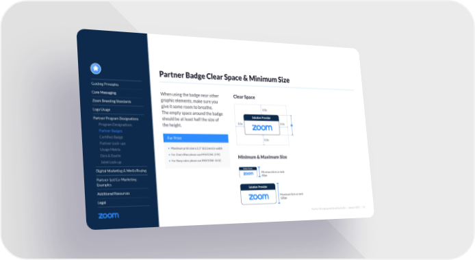 Partner Messaging and Branding Guide | January 2022 | 52 Guiding Principles Core Messaging Zoom Branding Standards Logo Usage Partner Program Designations Program Designations Partner Badges Certified Badge Partner Lock-ups Usage Matrix Do’s & Don’ts Joint Lock-up Digital Marketing & Media Buying Partner-Led Co-Marketing Examples Additional Resources Legal When using the badge near other graphic elements, make sure you give it some room to breathe. The empty space around the badge should be at least half the size of the height. Partner Badge Clear Space & Minimum Size Clear Space x • Maximum print size is 2.5” (63.5mm) in width • For Zoom Blue please use PANTONE 279C • For Navy color please use PANTONE 655C For Print Minimum & Maximum Size Minimum Size on web Maximum Size on web 60px 120px 0.5x 0.5x 0.5x 0.5x