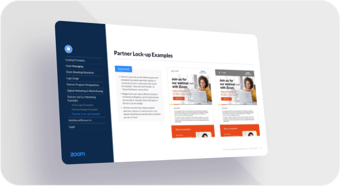 Partner Messaging and Branding Guide | January 2022 | 75 Guiding Principles Core Messaging Zoom Branding Standards Logo Usage Partner Program Designations Digital Marketing & Media Buying Partner-Led Co-Marketing Examples Joint Logo Examples Partner Badge Examples Partner Lock-up Examples Additional Resources Legal Partner Lock-up Examples • Partners may only use the following approved phrase(s) to promote, advertise, market, or communicate their relationship with Zoom: for example, “Zoom Service Provider”, or “Zoom Distributor,” and so forth • Badges/Lock-ups require different levels of certification/obligation, and if required steps are not met or renewed, Zoom will expire a Partner’s use of a badge • Partners cannot state, imply, promote, advertise, market, or communicate in any manner that they are a preferred or exclusive partner of Zoom Important