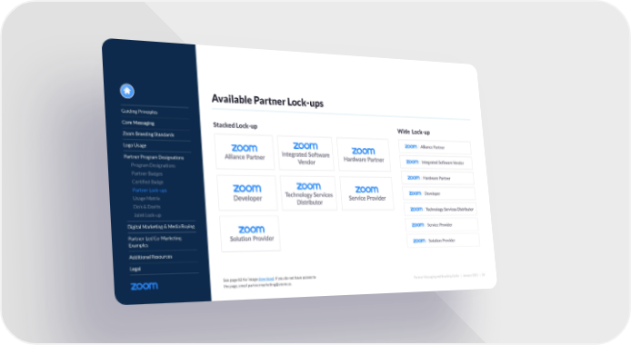 Partner Messaging and Branding Guide | January 2022 | 58 Guiding Principles Core Messaging Zoom Branding Standards Logo Usage Partner Program Designations Program Designations Partner Badges Certified Badge Partner Lock-ups Usage Matrix Do’s & Don’ts Joint Lock-up Digital Marketing & Media Buying Partner-Led Co-Marketing Examples Additional Resources Legal Available Partner Lock-ups Stacked Lock-up Wide Lock-up See page 82 for image download. If you do not have access to the page, email [email protected].