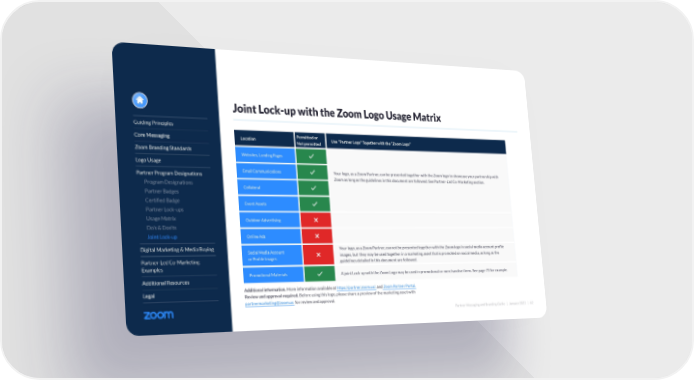 Partner Messaging and Branding Guide | January 2022 | 62 Guiding Principles Core Messaging Zoom Branding Standards Logo Usage Partner Program Designations Program Designations Partner Badges Certified Badge Partner Lock-ups Usage Matrix Do’s & Don’ts Joint Lock-up Digital Marketing & Media Buying Partner-Led Co-Marketing Examples Additional Resources Legal Joint Lock-up with the Zoom Logo Usage Matrix Location Permitted or Not permitted Use “Partner Logo” Together with the “Zoom Logo” Websites, Landing Pages Your logo, as a Zoom Partner, can be presented together with the Zoom logo to showcase your partnership with Zoom as long as the guidelines in this document are followed. See Partner-Led Co-Marketing section. Email Communications Collateral Event Assets Outdoor Advertising Online Ads Social Media Account or Profile Images Your logo, as a Zoom Partner, can not be presented together with the Zoom logo in social media account profile images, but they may be used together in a marketing asset that is promoted on social media, as long as the guidelines detailed in this document are followed. Promotional Materials A joint Lock-up with the Zoom Logo may be used in promotional or merchandise items. See page 73 for example. Additional information. More information available at https://partner.zoom.us/, and Zoom Partner Portal. Review and approval required. Before using this logo, please share a preview of the marketing asset with [email protected] for review and approval.