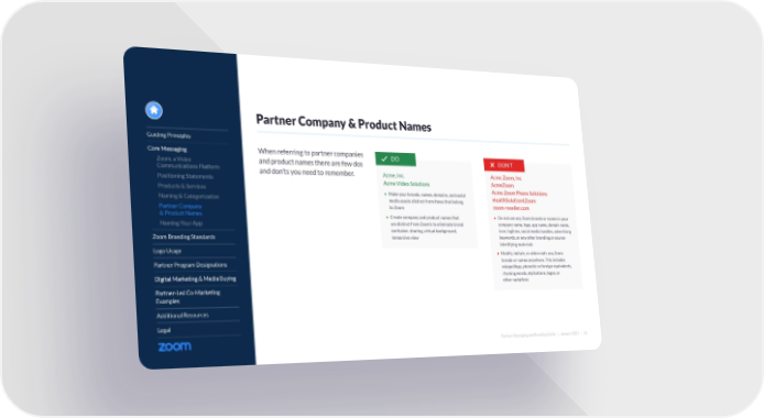 Partner Messaging and Branding Guide | January 2022 | 16 Guiding Principles Core Messaging Zoom, a Video Communications Platform Positioning Statements Products & Services Naming & Categorization Partner Company & Product Names Naming Your App Zoom Branding Standards Logo Usage Partner Program Designations Digital Marketing & Media Buying Partner-Led Co-Marketing Examples Additional Resources Legal Partner Company & Product Names Acme, Inc. Acme Video Solutions • Make your brands, names, domains, and social media assets distinct from those that belong to Zoom • Create company and product names that are distinct from Zoom’s to eliminate brand confusion. sharing, virtual background, immersive view DO Acme Zoom, Inc AcmeZoom Acme Zoom Phone Solutions HeatlhSolution4Zoom zoom-reseller.com • Do not use any Zoom brands or names in your company name, logo, app name, domain name, icon, taglines, social media handles, advertising keywords, or any other branding or source- identifying materials • Modify, imitate, or abbreviate any Zoom brands or names anywhere. This includes misspellings, phonetic or foreign equivalents, rhyming words, stylizations, logos, or other variations When referring to partner companies and product names there are few dos and don’ts you need to remember. DON’T