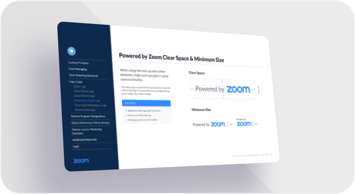 Partner Messaging and Branding Guide | January 2022 | 39 When using the lock-up with other elements, make sure you give it some room to breathe. The empty space around the lock-up should be at least the same as the height. To ensure the lock-up is legible do not go any smaller than 32px in height. Powered by Zoom Clear Space & Minimum Size • Requires written approval from Zoom • Please use CMYK lock-ups • Maximum print size is 3” in width For Print Clear Space 32px 32px Minimum Size Guiding Principles Core Messaging Zoom Branding Standards Logo Usage Zoom Logo Zoom Phone Logo Zoom Rooms Logo Powered by Zoom Logo Zoom App Marketplace Logo Zoom Events Logo Partner Program Designations Digital Marketing & Media Buying Partner-Led Co-Marketing Examples Additional Resources Legal