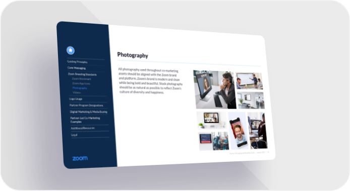 Partner Messaging and Branding Guide | January 2022 | 22 Photography All photography used throughout co-marketing assets should be aligned with the Zoom brand and platform. Zoom’s brand is modern and clean while being bold and beautiful. Stock photography should be as natural as possible to reflect Zoom’s culture of diversity and happiness. Guiding Principles Core Messaging Zoom Branding Standards Zoom Wordmark Zoom App Icons Photography Videos Logo Usage Partner Program Designations Digital Marketing & Media Buying Partner-Led Co-Marketing Examples Additional Resources Legal