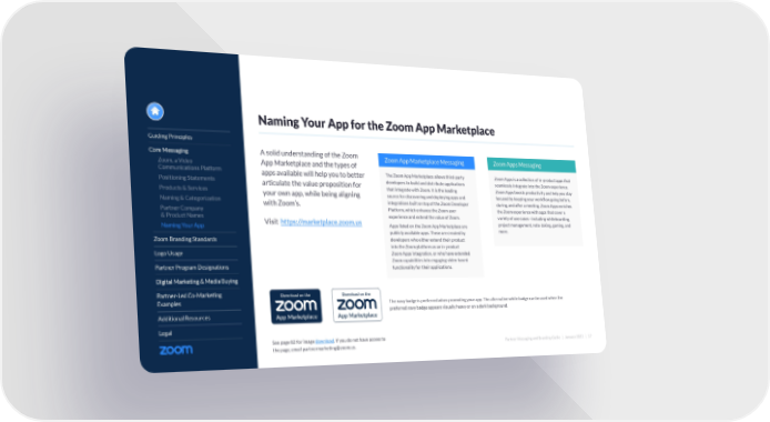 Partner Messaging and Branding Guide | January 2022 | 17 Guiding Principles Core Messaging Zoom, a Video Communications Platform Positioning Statements Products & Services Naming & Categorization Partner Company & Product Names Naming Your App Zoom Branding Standards Logo Usage Partner Program Designations Digital Marketing & Media Buying Partner-Led Co-Marketing Examples Additional Resources Legal A solid understanding of the Zoom App Marketplace and the types of apps available will help you to better articulate the value proposition for your own app, while being aligning with Zoom’s. Visit https://marketplace.zoom.us Zoom Apps is a collection of in-product apps that seamlessly integrate into the Zoom experience. Zoom Apps boosts productivity and help you stay focused by keeping your workflow going before, during, and after a meeting. Zoom Apps enriches the Zoom experience with apps that cover a variety of use cases—including whiteboarding, project management, note-taking, gaming, and more. Zoom Apps Messaging The Zoom App Marketplace allows third-party developers to build and distribute applications that integrate with Zoom. It is the leading source for discovering and deploying apps and integrations built on top of the Zoom Developer Platform, which enhance the Zoom user experience and extend the value of Zoom. Apps listed on the Zoom App Marketplace are publicly available apps. These are created by developers who either extend their product into the Zoom platform as an in-product Zoom Apps integration, or who have extended Zoom capabilities into engaging video-based functionality for their applications. Zoom App Marketplace Messaging Naming Your App for the Zoom App Marketplace See page 82 for image download. If you do not have access to the page, email [email protected]. The navy badge is preferred when promoting your app. The alternative white badge can be used when the preferred navy badge appears visually heavy or on a dark background.