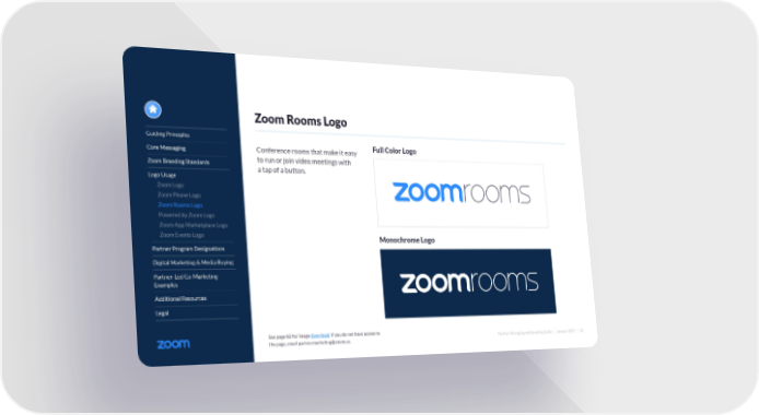 Partner Messaging and Branding Guide | January 2022 | 33 Guiding Principles Core Messaging Zoom Branding Standards Logo Usage Zoom Logo Zoom Phone Logo Zoom Rooms Logo Powered by Zoom Logo Zoom App Marketplace Logo Zoom Events Logo Partner Program Designations Digital Marketing & Media Buying Partner-Led Co-Marketing Examples Additional Resources Legal Conference rooms that make it easy to run or join video meetings with a tap of a button. Zoom Rooms Logo Full Color Logo Monochrome Logo See page 82 for image download. If you do not have access to the page, email [email protected].