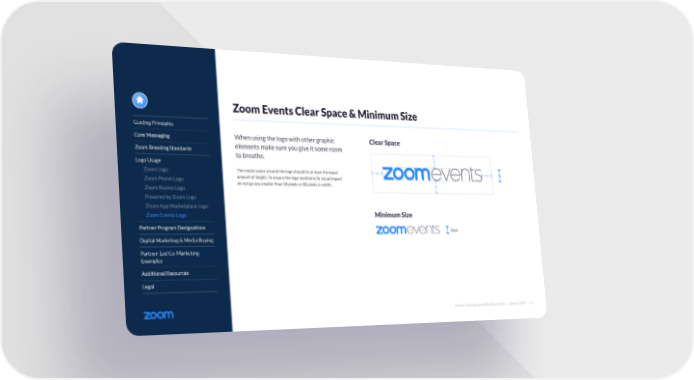Partner Messaging and Branding Guide | January 2022 | 47 When using the logo with other graphic elements make sure you give it some room to breathe. The empty space around the logo should be at least the equal amount of height. To ensure the logo maintains its visual impact do not go any smaller than 18 pixels or 80 pixels in width. Zoom Events Clear Space & Minimum Size 32px Clear Space Minimum Size Guiding Principles Core Messaging Zoom Branding Standards Logo Usage Zoom Logo Zoom Phone Logo Zoom Rooms Logo Powered by Zoom Logo Zoom App Marketplace Logo Zoom Events Logo Partner Program Designations Digital Marketing & Media Buying Partner-Led Co-Marketing Examples Additional Resources Legal