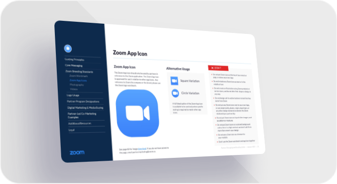 Partner Messaging and Branding Guide | January 2022 | 21 Zoom App Icon The Zoom App Icon should only be used by partners in reference to the Zoom application. The Zoom App Icon is approved for use in relation to other app icons. Any reference to Zoom the company or the brand, please use the Zoom logo wordmark. Zoom App Icon Square Variation Alternative Usage Circle Variation A full bleed option of the Zoom App Icon is available to be used only when specific styling is required to match other app icons. See page 82 for image download. If you do not have access to the page, email [email protected]. • Do not put Zoom icons at the top of your email, or page, or above your own logo • Do not include any Zoom icons as text or in the middle of text • Do not create an illustration using Zoom products or service icons, and do not alter their shape or design in any way • Do not design call-to-action buttons to look like they came from Zoom • Do not put any Zoom icons next to your own logo, or use ampersands, pluses, x signs, equal signs, or any other design elements to denote the Zoom relationship or partnership • Do not put Zoom icons on top of other images, such as patterns or textures • Do not put Zoom icons on a colored background unless there is a high contrast and don’t add them more than once in your design • Do not use a Zoom icon as a favicon for your website • Don’t use the Zoom wordmark and app icon together DON’T Guiding Principles Core Messaging Zoom Branding Standards Zoom Wordmark Zoom App Icons Photography Videos Logo Usage Partner Program Designations Digital Marketing & Media Buying Partner-Led Co-Marketing Examples Additional Resources Legal