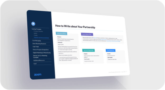 Partner Messaging and Branding Guide | January 2022 | 9 Guiding Principles Growing Together Agility Clarity Partner-Led Announcements Core Messaging Zoom Branding Standards Logo Usage Partner Program Designations Digital Marketing & Media Buying Partner-Led Co-Marketing Examples Additional Resources Legal How to Write about Your Partnership Header: [Partner Name] Teams Up with Zoom for [xyz integration or agreement.] Subhead: Major benefit. [Partner Name] today announced that they have joined forces with Zoom Video Communications, Inc. to [service brought to market]. [Details of integration/partnership, benefits to customers.] [Quote from company executive.] “I am proud team up with [company] to bring xyz to market,” said [Zoom employee], [title], for Zoom. “[Key benefits restated]”. Website & Blog Header: Delivering Zoom’s video communications platform Sub-header: Contact us to learn more Social & Digital Ads Header: A proud Zoom partner Sub-header: Contact me to learn more Email Signature We are proud to partner with @zoom to bring our customers an industry-leading solution for video communications. Contact us today to learn how @Company Name can help your business with a reliable, scalable, and frictionless solution for video, phone, chat, and collaboration! #ZoomPartner #InsertYourOwnHashtag Social Media Post
