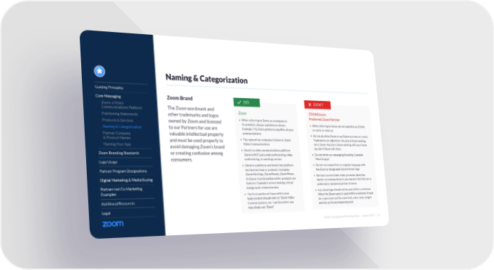 Partner Messaging and Branding Guide | January 2022 | 15 Guiding Principles Core Messaging Zoom, a Video Communications Platform Positioning Statements Products & Services Naming & Categorization Partner Company & Product Names Naming Your App Zoom Branding Standards Logo Usage Partner Program Designations Digital Marketing & Media Buying Partner-Led Co-Marketing Examples Additional Resources Legal Naming & Categorization ZOOM/zoom Preferred Zoom Partner • When referring to Zoom, do not capitalize as ZOOM, or zoom, or zoom.us • Do not pluralize Zoom or use Zoom as a noun or a verb. Trademarks are adjectives. You join a Zoom meeting, not a Zoom. You join a Zoom meeting with your team; you don’t Zoom with them • Do not mimic our messaging/branding. Example: “Meet Happy” • Do not use competitive or negative language with the Zoom or designated Zoom Partner logo • Partners cannot state, imply, promote, advertise, market, or communicate in any manner that they are a preferred or exclusive partner of Zoom • Any Zoom logo should not be used within a sentence. When the Zoom name is used within a sentence it must be in plain text and the same font, color, style, weight and size as the accompanying text DON’T Zoom Brand The Zoom wordmark and other trademarks and logos owned by Zoom and licensed to our Partners for use are valuable intellectual property and must be used properly to avoid damaging Zoom’s brand or creating confusion among consumers. Zoom • When referring to Zoom, as a company or its products, always capitalize as shown. Example: The Zoom platform simplifies all your communications • The name of our company is Zoom or Zoom Video Communications • Zoom is a video communications platform. Zoom is NOT just a web conferencing, video conferencing, or meetings service • Zoom is a platform, and inside that platform we have services or products. Examples: Zoom Meetings, Zoom Rooms, Zoom Phone, OnZoom. Functionalities within products are features. Examples: screen sharing, virtual background, immersive view • The first mention of Zoom within your body content should refer to “Zoom Video Communications, Inc.” and thereafter you may simply use “Zoom” DO