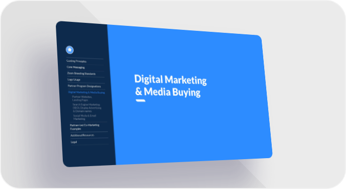 Guiding Principles Core Messaging Zoom Branding Standards Logo Usage Partner Program Designations Digital Marketing & Media Buying Partner Websites, Landing Pages Search Engine Marketing (SEO), Display Advertising & Domain names Social Media & Email Marketing Partner-Led Co-Marketing Examples Additional Resources Legal Digital Marketing & Media Buying