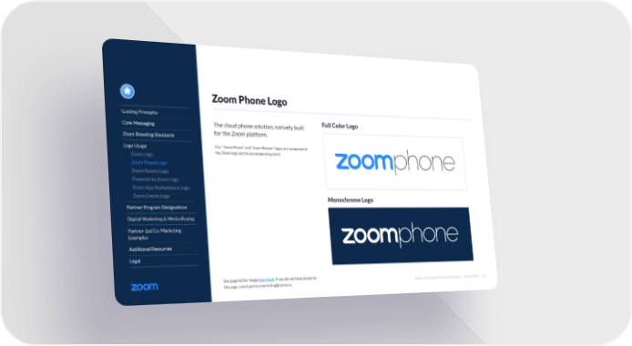 Partner Messaging and Branding Guide | January 2022 | 30 Guiding Principles Core Messaging Zoom Branding Standards Logo Usage Zoom Logo Zoom Phone Logo Zoom Rooms Logo Powered by Zoom Logo Zoom App Marketplace Logo Zoom Events Logo Partner Program Designations Digital Marketing & Media Buying Partner-Led Co-Marketing Examples Additional Resources Legal The cloud phone solution, natively built for the Zoom platform. Our “Zoom Phone” and “Zoom Rooms” logos are composed of the Zoom logo and its accompanying word. Zoom Phone Logo Full Color Logo Monochrome Logo See page 82 for image download. If you do not have access to the page, email partnermarketing@zoom.us.