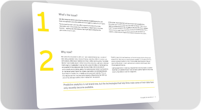 What’s the issue? Very few companies are fully exploiting the potential of predictive analytics. And At the outset, issues range from working out how to derive benefits from these new aspirations also often collide with the struggle to contain and cut IT spend. information and in which context such data might be relevant. There is also a The key questions start with the ability to quantify the value of available need to prioritize those activities, not least as views may differ sharply between information within the context of an organization, a department or business what IT considers important versus what the rest of the business does. Finally, function — working out which data sources might help to strengthen the there is the challenge of determining how to perform and operationalize generation of new insights. analytics, while taking the impact on processes and behaviors into account. Why now? We operate in a digital world, with vast — and constantly increasing — volumes of Predictive analytics is not brand new, but the technologies that help firms make data being generated. Every minute of the day, more than 200 million emails are sense of their data have only recently become available. This is allowing firms to sent globally, while Google receives more than 2 million search queries. The retailer uncover and exploit patterns in their historical data, identifying both risks and Walmart now handles about 1 million transactions every hour, adding to a database opportunities ahead. In short, businesses can use data to look forward, rather that is nearly 2.5 petabytes in size. By 2020, some 450 billion online transactions than at past performance. are expected to take place every day. Sources of data, both structured and Leading organizations increasingly recognize that predictive analytics can deliver unstructured, are multiplying rapidly, from external social networking interactions more than just customer insight; it can also have a positive impact on compliance, to internal call center transcripts. Indeed, organizations now embrace data as a security, fraud detection and risk management. fourth factor of production, alongside capital, people and materials. They use it to help sharpen their business performance by differentiating their offerings, uncovering new opportunities and minimizing their risk exposure. Predictive analytics is not brand new, but the technologies that help firms make sense of their data have only recently become available. 5 Insights for executives | 3