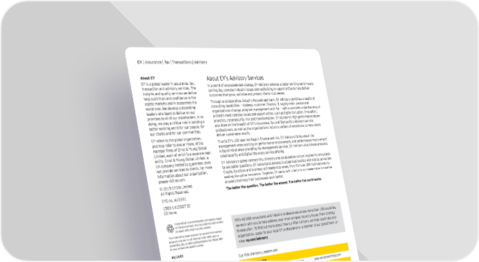 EY | Assurance | Tax | Transactions | Advisory About EY About EY’s Advisory Services EY is a global leader in assurance, tax, In a world of unprecedented change, EY Advisory believes a better working world means transaction and advisory services. The solving big, complex industry issues and capitalizing on opportunities to help deliver insights and quality services we deliver outcomes that grow, optimize and protect clients’ businesses. help build trust and confidence in the capital markets and in economies the Through a collaborative, industry-focused approach, EY Advisory combines a wealth of world over. We develop outstanding consulting capabilities — strategy, customer, finance, IT, supply chain, people and leaders who team to deliver on our organizational change, program management and risk — with a complete understanding of promises to all of our stakeholders. In so a client’s most complex issues and opportunities, such as digital disruption, innovation, doing, we play a critical role in building a analytics, cybersecurity, risk and transformation. EY Advisory’s high-performance teams better working world for our people, for also draw on the breadth of EY’s Assurance, Tax and Transaction Advisory service our clients and for our communities. professionals, as well as the organization’s industry centers of excellence, to help clients EY refers to the global organization, deliver sustainable results. and may refer to one or more, of the True to EY’s 150-year heritage in finance and risk, EY Advisory thinks about risk member firms of Ernst & Young Global management when working on performance improvement, and performance improvement Limited, each of which is a separate legal is top of mind when providing risk management services. EY Advisory also infuses analytics, entity. Ernst & Young Global Limited, a cybersecurity and digital into every service offering. UK company limited by guarantee, does EY Advisory’s global connectivity, diversity and collaborative culture inspires its consultants not provide services to clients. For more to ask better questions. EY consultants develop trusted relationships with clients across the information about our organization, C-suite, functions and business unit leadership levels, from Fortune 100 multinationals to please visit ey.com. leading disruptive innovators. Together, EY works with clients to co-create more innovative © 2015 EYGM Limited. answers that help their businesses work better. All Rights Reserved. The better the question. The better the answer. The better the world works. EYG no. AU3391 1503-1415327 EC ED None. In line with EY’s commitment to minimize its impact on the environment, this document has been printed With 40,000 consultants and industry professionals across more than 150 countries, on paper with a high recycled content. we work with you to help address your most complex industry issues, from strategy This material has been prepared for general informational to execution. To find out more about how our Risk Advisory services could help your purposes only and is not intended to be relied upon as accounting, tax, or other professional advice. Please refer organization, speak to your local EY professional or a member of our global team, or to your advisors for specific advice. view: ey.com/advisory ey.com Our Risk Advisory Leaders are: Global Risk Leader Paul van Kessel +31 88 40 71271 [email protected] Global Internal Audit Leader Michael O’Leary +1 585 987 4605 [email protected] Americas Risk Life Sciences Leader Sanjay Narain +1 212 773 7879 [email protected] Area Risk Leaders Americas Amy Brachio +1 612 371 8537 [email protected] EMEIA Jonathan Blackmore +971 4 312 9921 [email protected] Asia-Pacific Iain Burnet +61 8 9429 2486 [email protected] Japan Yoshihiro Azuma +81 3 3503 1100 [email protected]