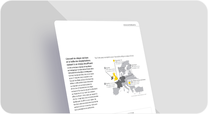 www.ey.com/fr/attractivite L’accueil de sièges sociaux Top 5 des pays européens pour l’accueil de sièges sociaux (2016) et la taille des implantations 1 Royaume-Uni restent à un niveau insuffisant 106 projets en 2016 Un des principaux signaux d’inquiétude 150 projets en 2015 est indiqué par le retard de la France dans 4 Irlande 2 Allemagne l’attractivité de fonctions stratégiques. 23 projets en 2016 3 Pays-Bas 35 projets en 2016 16 projets en 2015 26 projets en 2016 48 projets en 2015 Comme l’année dernière, elle ne se classe 27 projets en 2015 e qu’au 5 rang des pays européens pour l’accueil de sièges sociaux d’entreprises. Même si cette performance décevante se situe dans un contexte global de 5 France Total des sièges sociaux en Europe diminution d’implantations de sièges 16 projets en 2016 265 projets en 2016 sociaux en Europe, et plus particulièrement 11 projets en 2015 294 projets en 2015 au Royaume-Uni qui subit les premiers effets du Brexit (-44 projets par rapport à 2015), il s’agit dans les prochaines années de décupler les efforts pour capter les fonctions décisionnelles d’entreprises de Source : European Investment Monitor, EY, 2017 secteurs à forte croissance, mais aussi leurs prestataires et partenaires. Les projets ne créent pas Moyenne des emplois créés par projet (2016) suffisamment d’emplois (France, Europe et sélection de pays) Autre illustration de la faible valeur délivrée par les investissements étrangers, le Pays Nombre Nombre Emplois nombre moyen d’emplois (22) se situe d’emplois 2016 de projets 2016 par projet parmi les plus bas en Europe, certes Royaume-Uni 43 165 1 144 38 au-dessus de l’Allemagne (19), mais à la Pologne 22 074 256 86 moitié de la moyenne européenne, celle du Allemagne 19 961 1 063 19 Royaume-Uni ou de l’Espagne. Le moteur Roumanie 17 545 132 133 emploi des investisseurs étrangers est France 16 980 779 22 évidemment freiné par la complexité de Serbie 16 396 46 356 notre marché du travail et un coût horaire qui reste trop élevé par rapport à celui de Russie 15 064 205 73 ses concurrents (36,78 €/h pour la France République Tchèque 14 292 110 130 contre 35,25 €/h pour l’Allemagne et Espagne 12 969 308 42 24,99 €/h pour le Royaume-Uni7 , dans les Hongrie 12 450 107 116 industries et les services marchands). Europe Centrale et Orientale 135 632 1 342 101 Europe de l’Ouest 124 041 4 503 28 Total 259 673 5 845 44 7 Centre d’observation économique et de recherche pour Source : European Investment Monitor, EY, 2017 l’expansion de l’économie et le développement des entreprises : e “Les coûts de la main d’œuvre dans l’Union européenne au 4 trimestre 2016” Baromètre EY de l’attractivité de la France − Mai 2017 17