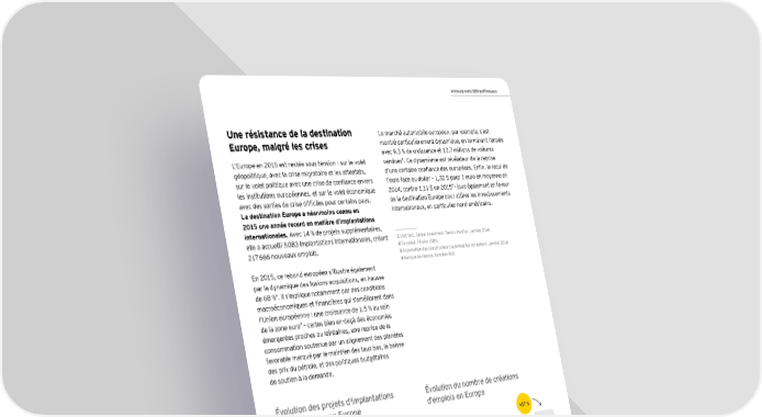 www.ey.com/attractiveness Une résistance de la destination Le marché automobile européen, par exemple, s’est Europe, malgré les crises montré particulièrement dynamique, en terminant l’année avec 9,3 % de croissance et 13,7 millions de voitures L’Europe en 2015 est restée sous tension : sur le volet vendues3. Ce dynamisme est révélateur de la reprise géopolitique, avec la crise migratoire et les attentats, d’une certaine confiance des européens. Enfin, le recul de sur le volet politique avec une crise de confiance envers l’euro face au dollar – 1,32 $ pour 1 euro en moyenne en 4 les institutions européennes, et sur le volet économique 2014, contre 1,11 $ en 2015 – joue également en faveur avec des sorties de crise difficiles pour certains pays. de la destination Europe pour attirer les investissements La destination Europe a néanmoins connu en internationaux, en particulier nord-américains. 2015 une année record en matière d’implantations internationales. Avec 14 % de projets supplémentaires, elle a accueilli 5 083 implantations internationales, créant 1 UNCTAD, Global Investment Trends Monitor, Janvier 2016 217 666 nouveaux emplois. 2 Eurostat, Février 2016 3 Association des constructeurs automobiles européens, Janvier 2016 4 Banque de France, données BCE En 2015, ce rebond européen s’illustre également par la dynamique des fusions-acquisitions, en hausse de 68 %1. Il s’explique notamment par des conditions macroéconomiques et financières qui s’améliorent dans l’Union européenne : une croissance de 1,5 % au sein 2 de la zone euro – certes bien en-deçà des économies émergentes proches ou lointaines, une reprise de la consommation soutenue par un alignement des planètes favorable marqué par le maintien des taux bas, la baisse des prix du pétrole, et des politiques budgétaires de soutien à la demande. Évolution des projets d'implantations Évolution du nombre de créations internationales en Europe d'emplois en Europe +17 % +14 % 5 083 217 666 4 448 170 434 186 348 158 011 166 283 3 908 3 797 3 955 Source Global Investment Monitor, EY, 2016 Baromètre de l'Attractivité de la France 2016 7