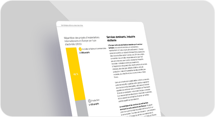 Une Europe active au cœur des crises Répartition des projets d'implantations Services dominants, industrie internationales en Europe par type résiliente d'activités (2015) L’Europe reste une destination dominée par le secteur 1 Activités tertiaires et commerciales tertiaire : les activités tertiaires et commerciales 2 086 projets représentent 41 % des projets d’investissement. L’Europe conserve toutefois son attractivité industrielle, puisque les sites de production restent stables avec 29 % des projets. Le maintien des activités industrielles en Europe n’est pas sans lien avec une mutation de fond de l’industrie mondiale : la tendance n’est plus (seulement) à l’implantation de grands sites visant de fortes économies 41 % d’échelle, dans des pays lointains à faibles coûts de production, mais à l’implantation de sites de taille plus modeste, plus réactifs et plus proches de leurs clients finaux. Dans un contexte où la globalisation a atteint un nouveau palier de maturité, voyant les coûts salariaux augmenter dans les économies émergentes, cette lame de fond est appelée à se renforcer avec la révolution de l’impression 3D et de la robotisation notamment. De plus, on assiste 2 Production à un mouvement de relocalisation d’activités industrielles, lié à la volonté des entreprises d’exercer un meilleur 1 455 projets contrôle qualité sur la production. Le numérique et les services aux entreprises dominent la carte sectorielle de l’Europe : ils pèsent 29 % près d’un quart du total des projets attirés en 2015 sur le sol européen. Tous deux en croissance – une croissance qui atteint +27 % pour les services aux entreprises et +6 % pour le numérique - ils continuent à faire de l’Europe une place tertiaire de premier plan à l’échelle mondiale. Les géants Microsoft et IBM ont choisi d’implanter de nouveaux centres de décision et de recherche en Europe, 3 Logistique respectivement à Copenhague et à Munich. 9 % 446 projets 4 Centres de R&D 8 % 386 projets 5 Centres de décision 6 % 294 projets 6 Autres Services 4 % 217 projets 4 % 7 Centres d’appels et de services 199 projets Source Global Investment Monitor, EY, 2016 10 Baromètre de l'Attractivité de la France 2016