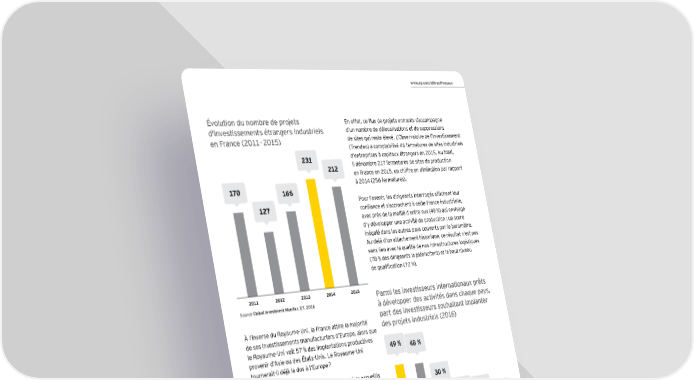 www.ey.com/attractiveness Évolution du nombre de projets En effet, ce flux de projets entrants s’accompagne d'investissements étrangers industriels d’un nombre de délocalisations et de suppressions en France (2011 - 2015) de sites qui reste élevé. L’Observatoire de l’Investissement (Trendeo) a comptabilisé 46 fermetures de sites industriels d’entreprises à capitaux étrangers en 2015. Au total, il dénombre 217 fermetures de sites de production en France en 2015, un chiffre en diminution par rapport à 2014 (256 fermetures). Pour l’avenir, les dirigeants interrogés affichent leur confiance et s’accrochent à cette France industrielle, avec près de la moitié d’entre eux (49 %) qui envisage d’y développer une activité de production : un score inégalé dans les autres pays couverts par le baromètre. Au-delà d’un attachement historique, ce résultat n’est pas sans lien avec la qualité de nos infrastructures logistiques (78 % des dirigeants la plébiscitent) et le haut niveau de qualification (72 %). Source Global Investment Monitor, EY, 2016 Parmi les investisseurs internationaux prêts à développer des activités dans chaque pays, part des investisseurs souhaitant implanter À l’inverse du Royaume-Uni, la France attire la majorité des projets industriels (2016) de ses investissements manufacturiers d’Europe, alors que le Royaume-Uni voit 57 % des implantations productives 49 % provenir d’Asie ou des États-Unis. Le Royaume-Uni 48 % tournerait-il déjà le dos à l’Europe ? S’ils sont plus nombreux, les projets industriels accueillis 30 % en France sont en revanche deux fois moins pourvoyeurs d’emplois que chez nos voisins britanniques. Malgré 20 % la création de nouvelles implantations par de grands 19 % industriels internationaux, comme Mecaplast ou Fuji 15 % Electric, les projets sont à 81 % des extensions d’unités existantes. Ils créent en moyenne 31 emplois, un chiffre en augmentation par rapport à 2014 (25 emplois). Le manque de flexibilité et le coût du travail ont raison des vrais « greenfields » industriels et poussent les investisseurs à la prudence. Ceux-ci s’inscrivent davantage France Belgique Portugal Royaume-Uni Allemagne Pays-Bas dans un mouvement de maintien et de restructuration Source Baromètre EY de l’attractivité dans 6 pays, 2016 de leur présence plutôt que dans un développement franc et massif de la production en France. Baromètre de l'Attractivité de la France 2016 23