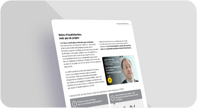 www.ey.com/attractiveness Moins d’insatisfaction, mais peu de projets La France suscite plus d’affection que d’adhésion. L’attachement à la France ne déclenche pas l’achat, Son rayonnement touristique et créatif, et - sans doute - du moins pas autant que ses voisins britanniques et le fait qu’elle ait été visée dramatiquement par le allemands. Si le French bashing a connu une accalmie, terrorisme, peuvent constituer la grille de lecture des 80 % celle-ci n’a pourtant pas déclenché de French buying. de décideurs interrogés « plutôt » ou « très satisfaits », en augmentation de 12 points par rapport à 2014. Une hypothèse d’autant plus vraisemblable que la part des non-implantés se déclarant satisfaits de la France fait Jean-Pierre Lieb un bond de 30 points, de 45 % en 2014 à 75 % de satisfaits Avocat associé, Ernst & Young cette année. Société d’Avocats, Responsable Tax Policy EMEIA Un chiffre qui témoigne de l’attachement à la France, La France distancée voire d’une certaine confiance dans sa capacité en matière à se redresser. Mais les perspectives des projets d’attractivité fiscale d’implantations traduisent une autre réalité : seuls 24 % 1:33 des décideurs envisagent d’implanter ou d’étendre des activités en France en 2016, un chiffre en nette diminution par rapport à l’année passée (-11 points). L'attractivité du site France selon les décideurs internationaux (2016) Diriez-vous que la France Votre entreprise envisage- t-elle ? est une localisation satisfaisante ? ? d’implanter ou d’étendre des activités en France ? 80 % 24 % +12 points -11 points des répondants déclarent des répondants déclarent " OUI ". " NON ". Source Baromètre EY de l’attractivité du site France 2016 (205 répondants) Retrouver toutes les données Baromètre de l'Attractivité de la France 2016 17