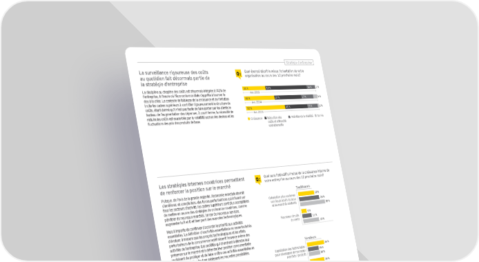 Stratégie d’entreprise La surveillance rigoureuse des coûts Q : Quel énoncé décrit le mieux l’orientation de votre au quotidien fait désormais partie de organisation au cours des 12 prochains mois? la stratégie d’entreprise La discipline au chapitre des coûts est désormais intégrée à l’ADN de 31 % 54 % 14 % 1 % l’entreprise, à l’heure où l’économie mondiale s’apprête à tourner le Avr. 2015 dos à la crise. Le contexte de faiblesse de la croissance et de l’inflation 40 % 37 % 17 % 6 % incite les cadres supérieurs à contrôler rigoureusement la structure de Avr. 2014 coûts, étant donné qu’il n’est pas facile de faire porter par les clients le 52 % 31 % 15 % 2 % fardeau de l’augmentation des dépenses. À court terme, la nécessité de Avr. 2013 réduire les coûts est exacerbée par la volatilité accrue des devises et les fluctuations des prix des produits de base. Croissance Réduction des Maintien de la stabilité Survie coûts et efficacité opérationnelle Les stratégies internes novatrices permettent Q : Quel sera l’objectif principal de la croissance interne de de renforcer la position sur le marché votre entreprise au cours des 12 prochains mois? Puisque, de l’avis de la grande majorité, l’économie mondiale devrait Traditionnels s’améliorer, et compte tenu des forces perturbatrices qui influent sur 19 % tous les secteurs d’activité, les cadres supérieurs sont plus susceptibles Orientation plus soutenue de mettre en œuvre des stratégies de croissance novatrices, comme vers les produits de base 24 % pénétrer de nouveaux marchés, lancer de nouveaux services, et les marchés existants 30 % augmenter la R et D et tirer parti des avancées technologiques. Mais il importe de continuer d’accorder la priorité aux activités 6 % Nouveaux circuits 11 % essentielles. La définition d’«activités essentielles» ne cesse toutefois de vente 19 % d’évoluer, à mesure que les progrès technologiques et les effets perturbateurs de la concurrence redéfinissent l’essence même des activités de l’entreprise. Les sociétés qui cherchent à étendre leur présence sur le marché et à défendre leur position concurrentielle Novateurs se doivent de protéger et de faire croître ces activités essentielles en constante évolution tout en saisissant les nouvelles possibilités. Exploitation des technologies 24 % pour développer de nouveaux 15 % marchés / produits 16 % Augmentation de la R et D / 20 % lancement de produits 17 % 12 % Modification de la gamme de 17 % produits et services existante 21 % La définition d’«activités 14 % Investissement dans de 14 % essentielles» ne cesse nouvelles régions et 12 % d’évoluer. Les progrès de nouveaux marchés 9 % technologiques et les Avr. 2013 Avr. 2014 Avr. 2015 effets perturbateurs de la concurrence redéfinissent l’essence même des activités de l’entreprise. Baromètre mondial de la confiance des entreprises | 5