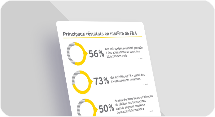 Principaux résultats en matière de F&A des entreprises prévoient procéder 56%à des acquisitions au cours des 12 prochains mois Page 8 des activités de F&A seront des 73%investissements novateurs Page 13 de plus d’entreprises ont l’intention de réaliser des transactions 50%dans le segment supérieur du marché intermédiaire Page 13 des entreprises ont l’intention de 47%réaliser davantage de transactions que l’an dernier Page 10 des entreprises ont mis en place une protection proactive contre 45%les cyberattaques dans le cadre du processus de F&A Page 12 Baromètre mondial de la confiance des entreprises
