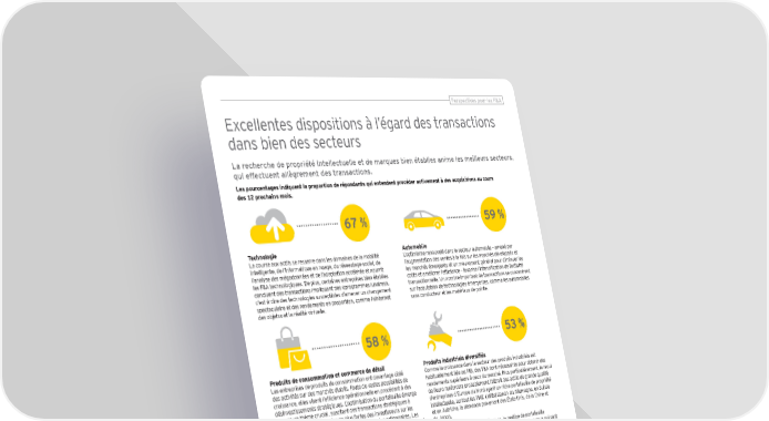 Perspectives pour les F&A Excellentes dispositions à l’égard des transactions dans bien des secteurs La recherche de propriété intellectuelle et de marques bien établies anime les meilleurs secteurs, qui effectuent allègrement des transactions. Les pourcentages indiquent la proportion de répondants qui entendent procéder activement à des acquisitions au cours des 12 prochains mois. 67 % 59 % Technologie Automobile La course aux actifs se resserre dans les domaines de la mobilité L’optimisme renouvelé dans le secteur automobile – amené par intelligente, de l’informatique en nuage, du réseautage social, de l’augmentation des ventes à la fois sur les marchés développés et l’analyse des mégadonnées et de l’adaptation accélérée et nourrit les marchés émergents et un mouvement général pour diminuer les les F&A technologiques. De plus, certaines entreprises bien établies coûts et améliorer l’efficience – favorise l’intensification de l’activité concluent des transactions impliquant des «programmes lunaires», transactionnelle. Un nombre important de transactions se concentrent c’est-à-dire des technologies susceptibles d’amener un changement sur l’acquisition de technologies émergentes, comme les automobiles spectaculaire et des rendements en proportion, comme l’«Internet sans conducteur et les matériaux de pointe. des objets» et la réalité virtuelle. 58 % 53 % Produits de consommation et commerce de détail Produits industriels diversifiés Les entreprises de produits de consommation ont davantage ciblé Comme la croissance dans le secteur des produits industriels est des activités sur des marchés établis. Faute de vastes possibilités de habituellement liée au PIB, des F&A sont nécessaires pour obtenir des croissance, elles visent l’efficience opérationnelle en procédant à des rendements supérieurs à ceux du marché. Plus particulièrement, le recul désinvestissements stratégiques. L’optimisation du portefeuille émerge de l’euro renforcera probablement l’attrait des actifs de grande qualité comme un thème crucial, suscitant des transactions stratégiques à d’entreprises d’Europe du Nord ayant un riche portefeuille de propriété la suite des pressions de plus en plus fortes des investisseurs sur les intellectuelle, surtout les PME (Mittelstand) en Allemagne, en Suisse entreprises pour qu’elles créent de la valeur pour les actionnaires. Les et en Autriche, la demande provenant des États-Unis, de la Chine et acteurs importants du secteur des produits de consommation optimisent du Japon. leur portefeuille de marques et leur présence sur le marché en se Dans ce contexte de faible croissance, la gestion de portefeuille départissant de leurs activités non essentielles et à faible croissance continuera de retenir une grande attention, surtout chez ceux qui sont et en redirigeant leurs investissements vers l’acquisition ou l’expansion touchés par la récente instabilité des prix de l’énergie. La réduction des d’activités à croissance rapide et à marges élevées. coûts demeure un impératif pour ces entreprises, en raison des pressions sur la croissance du chiffre d’affaires. 49 % Services financiers Les marges de taux d’intérêt comprimées et les pressions sur le capital réglementaire dans le secteur des banques et des marchés financiers peuvent donner lieu à d’autres regroupements dans le secteur et à des ventes d’actifs. Nous nous attendons également à voir se maintenir l’intérêt pour les segments des services financiers spécialisés et les technologies financières. Les sociétés d’assurance cherchent à améliorer la structure globale de leurs activités et de leur bilan en prévision de Solvabilité II. Pendant ce temps, les réassureurs cherchent à accroître et améliorer la valeur pour les investisseurs. Le contexte actuel fait des acquisitions une option intéressante. La présence internationale est devenue une priorité de plus en plus importante pour les gestionnaires d’actifs et de patrimoine. Puisque les marchés mondiaux en sont à des cycles économiques différents, les investisseurs s’attendent à ce que les gestionnaires d’actifs accèdent à des rendements du capital investi là où se trouvent les possibilités. Baromètre mondial de la confiance des entreprises | 15