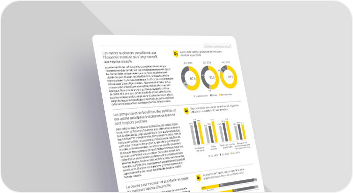 Contexte macroéconomique Les cadres supérieurs considèrent que Q : Que pensez-vous de la situation de l’économie l’économie mondiale plus large connaît mondiale aujourd’hui? une reprise durable Avr. 2014 Oct. 2014 Avr. 2015 La vaste majorité des cadres supérieurs considèrent désormais que l’économie mondiale s’améliore et s’est considérablement relevée depuis 14 % l’an dernier. Notre sondage révèle que la confiance est généralisée à 3 % l’échelle des pays. En 2014, seuls les États-Unis, le Royaume-Uni et la 31 % 44 % Chine suscitaient l’optimisme économique. En 2015, l’économie mondiale 60 % 53 % 83 % doit son essor à de multiples moteurs : l’économie américaine, dont la croissance était d’abord à peine perceptible, mais est désormais sans 9 % équivoque; l’économie de la Chine, qui, bien qu’au ralenti, continue de croître; et la zone euro, où l’ère d’austérité arrive à sa fin dans les 3 % pays économiquement forts et qui apprend à gérer les risques ailleurs. Malgré les risques de baisse toujours importants, les cadres supérieurs En détérioration Stable En amélioration s’efforcent de tirer parti des avantages potentiels de la croissance. Les perspectives de bénéfices des sociétés et Q : Veuillez évaluer votre degré de confiance à l’égard des des autres principaux indicateurs de marché indicateurs suivants à l’échelle mondiale. sont toujours positives 77 % 72 % 72 % Selon notre sondage, la croissance des bénéfices des sociétés inspire 65 % 64 % 69 % un peu moins confiance que l’an dernier, mais cette confiance demeure 54 % 58 % 54 % 54 % tout de même élevée, ce qui pourrait être le signe que le contexte dans 49 % 51 % lequel évoluent les entreprises entre dans une nouvelle phase. Dans de nombreuses sociétés, les programmes d’efficacité et de réduction des coûts à plus court terme mis en place au début de la crise financière mondiale sont moins rentables. Les économies de coûts qui auraient dû découler des programmes de transformation structurale à plus long terme en cours tardent à se concrétiser. Ces sociétés doivent donc Bénéfices de Accès Stabilité des marchés Évaluation des s’attendre à un essoufflement à court terme de la croissance de leurs l’entreprise au crédit à court terme actions / perspectives bénéfices. De plus, l’accès au crédit est difficile, mais, dans l’ensemble, des marchés boursiers favorable. Aux États-Unis, le programme d’assouplissement quantitatif Avr. 2014 Oct. 2014 Avr. 2015 arrive à sa fin, l’Europe a mis en place son propre programme et le Japon maintient le sien, ce qui devrait faciliter l’accès au crédit à l’échelle mondiale. La course pour recruter et maintenir en poste Q : Au chapitre de l’emploi, que compte faire votre les meilleurs talents s’intensifie organisation au cours des 12 prochains mois? La situation mondiale de l’emploi semble entrer dans une nouvelle phase. Les sociétés, en plus d’augmenter leur effectif, doivent relever 29 % 65 % 6 % le défi de maintenir en poste leurs meilleurs talents. Près des deux tiers Avr. 2015 des cadres supérieurs affirment qu’ils maintiennent la taille de leur 52 % 41 % 7 % effectif, tandis que le nombre de ceux qui prévoient l’accroître est Oct. 2014 en baisse par rapport à il y a six mois, mais inchangé en regard d’il 31 % 52 % 17 % y a un an. Le pourcentage de répondants qui s’attendent à réduire Avr. 2014 le nombre de leurs employés est le plus bas depuis la parution du premier Baromètre en 2009. La forte progression de l’emploi aux Créer des emplois / Maintenir l’effectif Réduire l’effectif États-Unis et au Royaume-Uni et l’amélioration de la situation dans la recruter des talents actuel zone euro incitent les sociétés à ne pas perdre de vue le recrutement de talents au moment où elles doivent défendre leur effectif contre les tentatives de recrutement de la part de leurs concurrentes. Les préoccupations géopolitiques persistent, Q : Quel est selon vous le plus important risque économique la volatilité des prix des produits de base et auquel votre entreprise sera exposée au cours des des devises augmente 6 à 12 prochains mois? Augmentation de l’instabilité 37 % Il n’est pas surprenant que, lorsque les sociétés qui examinent les politique mondiale et régionale principaux risques auxquels elles font face, les problèmes géopolitiques Accroissement de la volatilité des prix incessants, que ce soit en Europe de l’Est ou au Moyen-Orient, des produits de base et des devises 35 % constituent la principale préoccupation pour la majorité d’entre elles. Situation économique Ce qui surprend, et qui n’avait peut-être pas été prévu aussi récemment dans la zone euro 10 % qu’il y a six mois, c’est que la chute marquée des prix des produits de base et la volatilité croissante des devises sont devenues des sujets Contexte réglementaire 9 % d’inquiétude majeurs. Ces problèmes sont au deuxième rang des risques Ralentissement de la croissance sur d’entreprise, tout juste derrière les perturbations géopolitiques. À plus les principaux marchés émergents 7 % long terme, les politiques monétaires divergentes pourraient accroître la volatilité des devises et, avec les préoccupations géopolitiques, nuire à Déflation 2 % la capacité des cadres supérieurs de planifier l’avenir. 0 5 10 15 20 25 30 35 40 Baromètre mondial de la confiance des entreprises | 3
