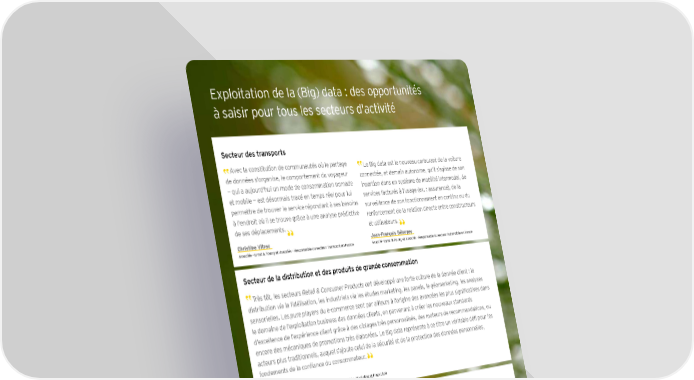 Exploitation de la (Big) data : des opportunités à saisir pour tous les secteurs d'activité Secteur des transports Avec la constitution de communautés où le partage Le Big data est le nouveau carburant de la voiture de données s'organise, le comportement du voyageur connectée, et demain autonome, qu’il s’agisse de son — qui a aujourd'hui un mode de consommation nomade insertion dans un système de mobilité intermodal, de et mobile — est désormais tracé en temps réel pour lui services facturés à l’usage (ex. : assurance), de la permettre de trouver le service répondant à ses besoins surveillance de son fonctionnement en continu ou du à l'endroit où il se trouve grâce à une analyse prédictive renforcement de la relation directe entre constructeurs de ses déplacements. et utilisateurs. Christine Vitrac Jean-François Bélorgey Associée - Ernst & Young et Associés - Responsable du secteur Transport en France Associé - Ernst & Young et Associés - Responsable du secteur Automobile en France Secteur de la distribution et des produits de grande consommation Très tôt, les secteurs Retail & Consumer Products ont développé une forte culture de la donnée client : la distribution via la fidélisation, les industriels via les études marketing, les panels, le géomarketing, les analyses sensorielles. Les pure players du e-commerce sont par ailleurs à l’origine des avancées les plus significatives dans le domaine de l’exploitation business des données clients, en parvenant à créer les nouveaux standards d’excellence de l’expérience client grâce à des ciblages très personnalisés, des moteurs de recommandations, ou encore des mécaniques de promotions très élaborées. Le Big data représente à ce titre un véritable défi pour les acteurs plus traditionnels, auquel s’ajoute celui de la sécurité et de la protection des données personnelles, fondements de la confiance du consommateur. David Naïm Associé - Ernst & Young Advisory - Responsable du pôle Stratégie, Marketing et Innovation Secteur de l’énergie et des utilities Le secteur de l’énergie est à l’aube d’une profonde mutation portée par la data, avec en particulier le déploiement programmé des compteurs intelligents. Le Big data est un des leviers majeurs qui permet de rendre les réseaux plus intelligents et plus sûrs, et cela au moindre coût, tout en répondant aux enjeux de la transition énergétique. Les données sont un élément stratégique pour assurer une meilleure maîtrise de la demande d’énergie (eau, gaz, électricité) tant à l’échelle nationale que locale (smart cities), mais aussi ouvrir plus largement le marché et enfin accompagner l’émergence de nouveaux usages. Mohamed Larabi Associé - Ernst & Young Advisory 1010 || (Big) data : où en sont les entreprises françaises ?