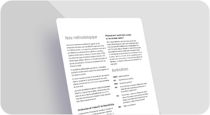 Note méthodologique Pourquoi avoir centré notre analyse sur les données clients ? Nous avons mené une enquête terrain auprès de 152 Parmi la quantité de données disponibles, les données entreprises françaises, avec des effectifs compris entre 500 clients sont celles qui sont, selon nous, directement liées à et 2 000 personnes, sur la base d’un questionnaire administré la croissance du chiffre d’affaires et au développement de par téléphone auprès de directeurs généraux, marketing, l’activité. Ce sont elles qui disposent, à moyen terme, du plus systèmes d'informations, financiers, relation clients et CRM. gros potentiel en termes d’amélioration de la performance Ces entreprises appartiennent à 5 secteurs d’activité : TMT commerciale des entreprises et de leur diversification vers de (Technologies, Médias, Télécoms), Distribution et produits de nouveaux métiers ou marchés. Ce qui ne signifie pas que les grande consommation, Transport et Automobile, Services données autres, telles que la consommation énergétique des financiers, Santé. bâtiments, ne puissent pas être source de profitabilité non négligeable. En parallèle de cette enquête quantitative, 12 entretiens qualitatifs ont été conduits auprès d’entreprises appartenant Abréviations aux secteurs couverts. En outre, nous avons construit notre Indice EY de Maturité Data sur la base de 10 variables auxquelles nous avons CAPEX Capital Expenditure affecté une note allant de –2 à +2 pour chaque entreprise KPI Key Performance Indicator de notre panel. Les scores permettent de capturer le degré d’avancement OPEX Operating Expenditure effectif sur chacune des variables. L’ensemble des notes PoC Proof of concept. L'expression désigne des projets obtenues par entreprise a été additionné pour en tirer pilotes déployés rapidement pour démontrer la 3 groupes statistiques qui traduisent le niveau global de faisabilité d'une opportunité maturité de chaque entreprise. PoV Proof of value. L'expression désigne des projets pilotes (PoC) auxquels sont associées des études d'impact pour évaluer leur rentabilité avec leur Construction de l'Indice EY de Maturité Data généralisation (phase d'industrialisation) L’indice de maturité agrège les réponses à 10 questions ROI Return on Investment factuelles portant sur l'état des lieux de la collecte et de l'analyse de la data (volume, diversité, profil, etc.), la gouvernance et l'implication des métiers, la finalité des modèles analytiques et la prise en compte des enjeux de sécurisation de la data. L’ensemble des modalités de réponses a été codé avec une échelle centrée allant de -2 à 2 en fonction du niveau de maturité estimé par les experts EY. Les réponses de chaque répondant ont ainsi permis de donner une note brute allant de -20 à 20. Les entreprises dont la note est négative ont été qualifiées de non matures, celles dont les notes allait de 0 à 9 ont été qualifiées de peu matures, et celles obtenant plus de 10 points ont été qualifiées de très matures. 42 | (Big) data : où en sont les entreprises françaises ?