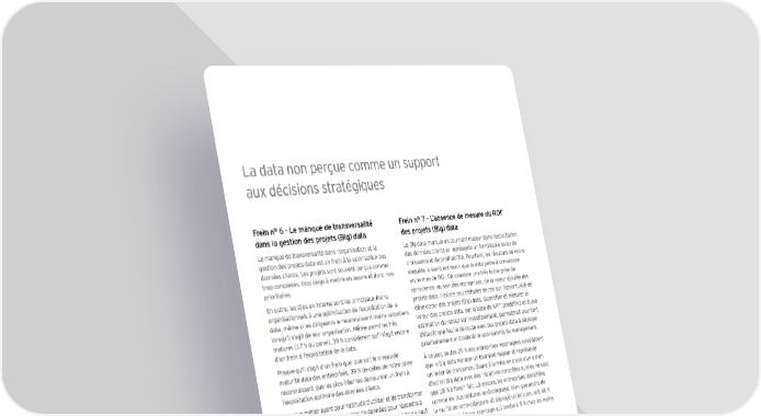 La data non perçue comme un support aux décisions stratégiques * Frein n° 6 - Le manque de transversalité Frein n° 7 - L’absence de mesure du ROI dans la gestion des projets (Big) data des projets (Big) data Le manque de transversalité dans l’organisation et la Le Big data marque un tournant majeur dans l’exploitation gestion des projets data est un frein à la valorisation des des données clients et représente un formidable levier de données clients. Les projets sont souvent perçus comme croissance et de profitabilité. Pourtant, les résultats de notre trop complexes, trop longs à mettre en œuvre et donc non enquête laissent entrevoir que la data peine à convaincre prioritaires. en termes de ROI. On constate une très faible prise de En outre, les silos en interne sont les principaux freins conscience, au sein des entreprises, de la valeur ajoutée des organisationnels à une optimisation de l’exploitation de la projets data. Il existe peu d'études de cas sur l’opportunité de data, même si les dirigeants le reconnaissent moins volontiers développer des projets (Big) data. Quantifier et mesurer la ** prédéfinis et d’une lorsqu’il s’agit de leur organisation. Même parmi les très valeur des projets data, sur la base de KPI matures (17 % du panel), 39 % considèrent qu’il s’agit encore estimation du retour sur investissement, permettrait pourtant d’un frein à l’exploitation de la data. d’établir une feuille de route avec des projets data à déployer prioritairement et d’obtenir le sponsorship du management. Preuve qu'il s'agit d'un frein quel que soit le niveau de À ce jour, seules 29 % des entreprises interrogées considèrent maturité data des entreprises, 39 % de celles de notre panel que le Big data marque un tournant majeur et représente reconnaissent que les silos internes demeurent un frein à un levier de croissance. Quant à la mise en place d’un « plan l'exploitation optimale des données clients. d’action Big data avec des initiatives concrètes », elles ne sont Chaque métier ayant pour habitude d’utiliser et de transformer que 18 % à l'avoir fait. Là encore, les entreprises identifiées les données issues de ses bases de données pour répondre à comme les plus matures se distinguent, bien que moins de ses propres enjeux métiers ou objectifs, le capital data ne peut la moitié de cette catégorie ait déployé un tel plan, soit 46 % pas circuler dans l’entreprise, ce qui explique une absence de précisément. Un pourcentage qui tombe à 5 % chez les moins vision unifiée. Raison pour laquelle les outils et technologies matures. Big data sont encore peu adoptés. Pour ce qui est du retour sur investissement en particulier, à En effet, ces solutions ne prennent leur pleine mesure qu’en ce jour, 58 % des entreprises interrogées n’ont pas cherché à exploitant les informations provenant de tous les systèmes quantifier la contribution des solutions à la performance de informatiques et des directions de l’entreprise. leur entreprise. Là encore, l’écart est énorme entre les plus matures (77 %) et les « non matures » (3 %). * ROI : Return on Investment ** KPI : Key Performance Indicator 22 | (Big) data : où en sont les entreprises françaises ?