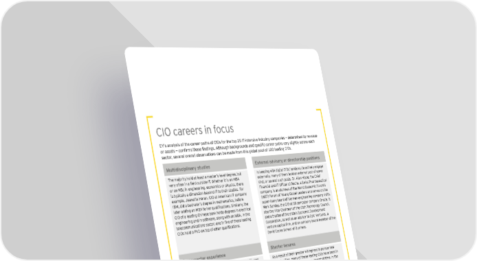 CIO careers in focus EY’s analysis of the career paths of CIOs for the top 25 IT-intensive industry companies — determined by revenue or assets — confirms these findings. Although backgrounds and specific career paths vary slightly across each sector, several overall observations can be made from this global pool of 100 leading CIOs. Multidisciplinary studies External advisory or directorship positions The majority hold at least a master’s-level degree, but In keeping with digital CIOs’ tendency to actively engage very often in a field outside IT. Whether it is an MBA externally, many of them hold an external post of some or an MSc in engineering, economics or physics, there kind, or several such posts. Dr. Alan Hippe, the Chief is typically a dimension beyond IT to their studies. For Financial and IT Officer of Roche, a Swiss Pharmaceutical example, Jeanette Horan, CIO at American IT company company, is an alumnus of the World Economic Forum’s IBM, did a bachelor’s degree in mathematics, before (WEF) Forum of Young Global Leaders and serves on the later adding an MBA to her qualifications. Similarly, the supervisory board of German engineering company Voith. CIO of a leading Chinese bank holds degrees in electrical Mark Sunday, the CIO at US computer company Oracle, is engineering and in software, along with an MBA. In the also the Vice-Chairman of the Utah Technology Council, telecommunications sector, one in five of these leading and a trustee of the state’s Economic Development CIOs hold a PhD on top of other qualifications. Corporation, as well as an advisor to Epic Ventures, a venture capital firm, and an advisory board member of the David Eccles School of Business. Cross-sector experience Shorter tenures Many leading CIOs have spent time working in different As a result of their greater willingness to pursue new industries. For example, Adriana Karaboutis switched opportunities, many of these leading CIOs have been in from a career in automotive, with roles at Ford and their posts for a relatively short amount of time. In the General Motors, to become the CIO of Dell, a US-based IT sector, for example, over half took up their current end-to-end solutions company. Anders Thulin, the CIO at roles in 2010 or later. And this is even more prevalent Swedish telecommunications firm Ericsson, had worked in telecommunications, where 60% have taken up in consulting, at McKinsey & Company. CIOs working their current roles since 2010. Across the IT-intensive in IT are more likely to have made such switches, but industries, over half the CIOs surveyed had been in their these switches are common throughout all four of these roles for less than three years. IT-intensive sectors. However, CIOs working in banking are much more likely to have had a prior role in financial services, rather than in a wholly different sector. Born to be digital | 33