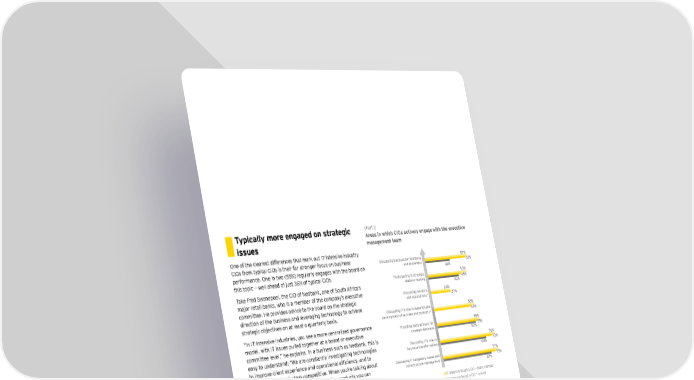Typically more engaged on strategic Chart 2 issues Areas in which CIOs actively engage with the executive management team One of the clearest differences that mark out IT-intensive industry CIOs from typical CIOs is their far stronger focus on business Discussing business performance 57% performance. One in two (55%) regularly engages with the board on and challenges 55% this topic — well ahead of just 36% of typical CIOs. 36% Participating in strategic 53% Take Fred Swanepoel, the CIO of Nedbank, one of South Africa’s decision-making 43% 45% major retail banks, who is a member of the company’s executive Discussing mergers 26% committee. He provides advice to the board on the strategic and acquisitions* 27% direction of the business and leveraging technology to achieve 55% strategic objectives on at least a quarterly basis. Discussing IT's role in research and nt development of services and products* e 50% m “In IT-intensive industries, you see a more centralized governance e Providing facts as basis for ag 59% g model, with IT issues pulled together at a board or executive strategic decisions n 55% e 52% committee level,” he explains. In a business such as Nedbank, this is easy to understand: “We are constantly investigating technologies Discussing IT's role in 76% to improve client experience and operational efficiency, and to business transformation Strategic 64% 72% make sure the bank stays competitive. When you’re talking about Discussing IT budgetary issues and 77% banking products today, there are very few products you can infrastructure management 67% 73% actually touch. The computer code facilitates the commitments we make to clients, so the technology environment is strategically IT-intensive industry CIO — board member important to building and maintaining trust in the organization,” IT-intensive industry CIO — overall Typical CIO he says. (Percentage of respondents who have chosen 8, 9 or 10 on a scale from 1 = do not engage at all to 10 = actively engage) * Answer option was not included into typical CIO survey (The DNA of the CIO) 12 | Born to be digital