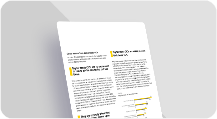 Career lessons from digital-ready CIOs Digital-ready CIOs are willing to leave For other IT leaders seeking to achieve similar outcomes in their their home turf. careers, three key points stand out in the approach and career choices of digital-ready CIOs: They show a greater enthusiasm to spend time elsewhere in the Digital-ready CIOs are far more open organization to get a deep understanding of the business. Nearly half (48%) believe that experience in another function is vital, to taking advice and trying out new compared with 33% of IT-intensive industry CIOs. Similarly, a ideas. greater proportion believes that it is necessary to have spent time in other companies, and that it’s important to have been on international assignments. The CIO of a major Chinese “CIOs have to be open to new practices. To some extent, the CIO telecommunications firm explains how, having initially graduated in has to showcase new technologies, so it’s a permanent challenge engineering, her career path involved her becoming the head of a for CIOs to keep themselves occupied on new things,” says Sanofi non-IT department, as well as the CEO of a subsidiary firm, before CIO Bruno Ménard. Mail.Ru CIO Alexander Gornyi also keeps an moving into her current role. This is explicitly supported by her open mind about new things to learn: “I love what I am doing, and I firm: “Our company has a personnel arrangement mechanism that am good at it; however, I continually strive for improvement. I allows a CIO to switch roles with other executives,” she notes. believe a willingness to learn is an absolute must,” he says. Furthermore, among digital-ready CIOs, nearly one in two (46%) Chart 13 remark that they could use some advice on their career progression, Requirements for becoming a CIO compared with 36% of IT-intensive industry CIOs. They also show a greater appetite for input from other sources, whether from their 94% peers, external consultants, the print media, online webcasts or Motivation and hard work others. 86% Involvement in supporting major 67% business projects 67% They are strongly interested 56% in building their career upon Degree and training in IT 47% management skills. Degree and training in business 49% Forty-nine percent of digital-ready CIOs hold a degree in business administration and management 37% and 24% even an MBA, compared with 14% of IT-intensive industry Experience in another 48% CIOs. Similarly, a higher proportion of them (35%) hold a degree in business function 33% science or engineering. And almost half of them (49%) believe that 38% a business degree or MBA is strongly required for the CIO role, International assignments compared with 37% of IT-intensive industry CIOs. 28% Career moves in different 37% Chart 12 companies 25% Discipline of education Digital-ready CIO IT-intensive industry CIO (Percentage of respondents who have chosen 8, 9 or 10 on a scale from 1 = not required at all 49% to 10 = absolutely required) Business 44% Not only a CIO’s responsibility 38% IT 41% All of this highlights a further important point in CIOs’ career paths, 35% but one that is less often considered. It is just as much the firm’s Science responsibility to find and develop tomorrow’s digital CIOs, as it is 31% the responsibility of those working in IT to embrace and pursue this 5% Other path. “Firms know that many CIOs are not typically the most 5% flamboyant, outgoing, risk-taking types. So companies may need to Digital-ready CIO IT-intensive industry CIO rethink their hiring processes to seek out a different caliber of (Percentage of respondents who obtained a level of education in this discipline) candidate,” argues EY’s Tom Velema. “If their business focuses on CIOs who keep the lights on, they shouldn’t be surprised that they’ve not found their change leaders.” 32 | Born to be digital