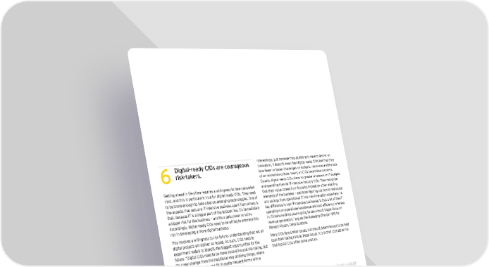 Digital-ready CIOs are courageous Interestingly, just because they additionally have to deliver on innovation, it doesn’t mean that digital-ready CIOs feel that they 6risk-takers. face fewer or lesser challenges on budgets, resources and the lack of an innovation culture. Nearly all CIOs have these concerns. Equally, digital-ready CIOs place no greater emphasis on IT budgets Getting ahead in life often requires a willingness to take calculated and spending than do IT-intensive industry CIOs. They recognize risks, and this is particularly true for digital-ready CIOs. They need that their value comes from focusing instead on other enabling to be brave enough to take a bet on emerging technologies. One of elements of the business — and from figuring out how to reallocate the aspects that sets any IT-intensive business apart from others is any savings from operational IT into new innovation elsewhere. “A that, because IT is a bigger part of the bottom line, it’s immediately key difference in non-IT-intensive businesses is that a lot of the IT a bigger risk for the business — and thus gets closer scrutiny. spending is on operational excellence and cost efficiency; whereas Accordingly, digital-ready CIOs need to be willing to embrace this in IT-intensive firms you’re going to see a much bigger focus on risk in developing a more digital business. revenue generation,” argues the Managing Director IT/IS for This involves a willingness to risk failure: understanding that not all Renault-Nissan, Celso Guiotoko. digital projects will deliver as hoped. As such, CIOs need to Many CIOs face similar issues, but should determine not to be held experiment widely to identify the biggest opportunities for the back from taking risks by these issues. It is in their attitude to risk future. “Digital CIOs need to be more innovative and risk-taking. But that typical CIOs often come unstuck. it’s a real change from the traditional way of doing things, where you argue for budgets, and fill in capital request forms with a business case and so on,” says EY’s Tom Velema. “Many IT leaders are risk averse — they don’t dare to take any step that isn’t proven,” argues UCB’s Herman de Prins. For example, “ Like an iPad that even two-year tight budgetary pressures faced by CIOs the world over are often cited as the reason why a new project can’t push ahead — and are a olds can use by pure intuition, common excuse used by many CIOs to avoid pushing ahead on new innovation or piloting exciting new digital projects. But digital-ready the success of digital CIOs are more often willing to find ways to turn such pressures to their advantage. For example, de Prins has a clear focus on IT transformation is defined by operational costs, which he has cut by 25% since joining the business, but he uses savings here to support his preferred focus the simplicity of it plus a layer on innovation: “If you think I have no cost pressure, then think again. I get beaten up on costs every day. But too many CIOs take of abstraction.” the view that ‘well, I have to cut costs, so I can’t do anything else,’” he says. Ashwin Goolab, IT Advisory Leader Africa, EY 28 | Born to be digital