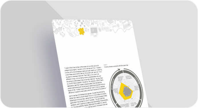 “I spend little time on back office and a lot on what you could Chart 9 categorize as digital,” explains UCB’s Herman de Prins. “I made a Priority of tasks compared with five years ago choice not to micromanage projects and get caught up in steering committees and so forth. We do 150 projects per year but I trust my team to manage them well. That frees up my time to do different things, such as being more connected externally and focusing on a few areas that are transformational,” he says. Even Shaping the future Controlling the so, he still finds scope for innovation. For example, UCB’s IT team T of the business impact of IT spend E N with the right on the organization X deployed a new flash memory-based system that boosted the E technology E M C overall performance of the company’s statistical programming by a P 100% U O T I factor of 20. “Is that a back-office thing? I don’t think so, because L O E N efficiency is good for everybody and most importantly for patients.” V 52% E Preparing and 55% Ensuring the D 48% developing the IT and security SAP Americas CIO Michael Golz agrees. He sees that embracing organization needs are up digital has meant a much clearer focus on more radical innovation for change and running elsewhere in the business, rather than on trying to squeeze limited 100% 54% 61% 78% gains from the company’s core IT systems. “You can optimize 48% endlessly, and it’s going to create some incremental improvements, 54% but the real spending is being redirected into platforms, around 68% analytics, big data, mobility and the cloud or whichever area has 81% the highest benefit for your company,” he says. Sustaining and extending the Providing insight This is borne out in the survey results. While for IT-intensive organization's strategies to support business and objectives decisions industry CIOs, the most notable increase in their focus has been on issues relating to ensuring basic IT needs are up and running, E T N N A E B M L digital-ready CIOs have been putting more attention on other E issues, such as enhancing business processes and preparing the organization for change. Even so, they do not forget the operational Digital-ready CIO IT-intensive industry CIO elements — understanding that smooth operational running is what allows them to have other focuses. (Percentage of respondents who have chosen 8, 9 or 10 on a scale from 1= much less a priority to 10 = much more a priority) Nevertheless, digital-ready CIOs do seek out bigger opportunities in IT infrastructure. But with one such opportunity, the cloud, the attraction for many IT leaders is that it has the potential to reduce the time and money spent on systems and infrastructure. Born to be digital | 27