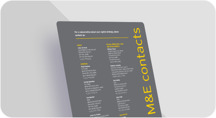 For a conversation about your capital strategy, please s contact us: Global Europe, Middle East, India John Harrison and Africa (EMEIA) Global Media & Entertainment William Fisher Transaction Advisory United Kingdom and Ireland Services Leader Media & Entertainment act [email protected] Transaction Advisory +1 212 773 6122 Services Leader wfi [email protected] Americas +44 20 7951 0432 Paul Sheahen Dietmar Koesling Northeast Germany, Switzerland, Austria nt Media & Entertainment Telecommunication, Media & Technology Transaction Tax Leader Transactions Advisory Services Leader [email protected] [email protected] +1 212 773 5578 +49 89 14331 17709 o Dorian Swerdlow Atul Mehta Northeast India Media & Entertainment Media & Entertainment Transaction Integration Leader Transaction Advisory [email protected] Support Leader +1 212 773 6179 [email protected] Dan Buchler +91 226 192 0210 West Ajay Shah Media & Entertainment India Transaction Advisory Media & Entertainment Services Leader Lead Advisory [email protected] Transaction Leader +1 213 977 7654 [email protected] Javier M. Rovira +91 226 192 0640 South America (excluding Brazil) Asia-Pacifi c Media & Entertainment Transaction Advisory Ben Kwan M&E c Services Leader China [email protected] Media & Entertainment +54 11 4875 4716 Operational Transaction Services Leader [email protected] +852 2849 9223 Ishwar Madhyastha Oceania Media & Entertainment Transaction Advisory Support Leader [email protected] +61 2 9248 5865 Capital Confi dence Barometer | 17